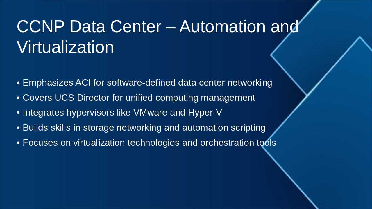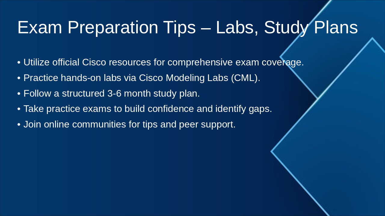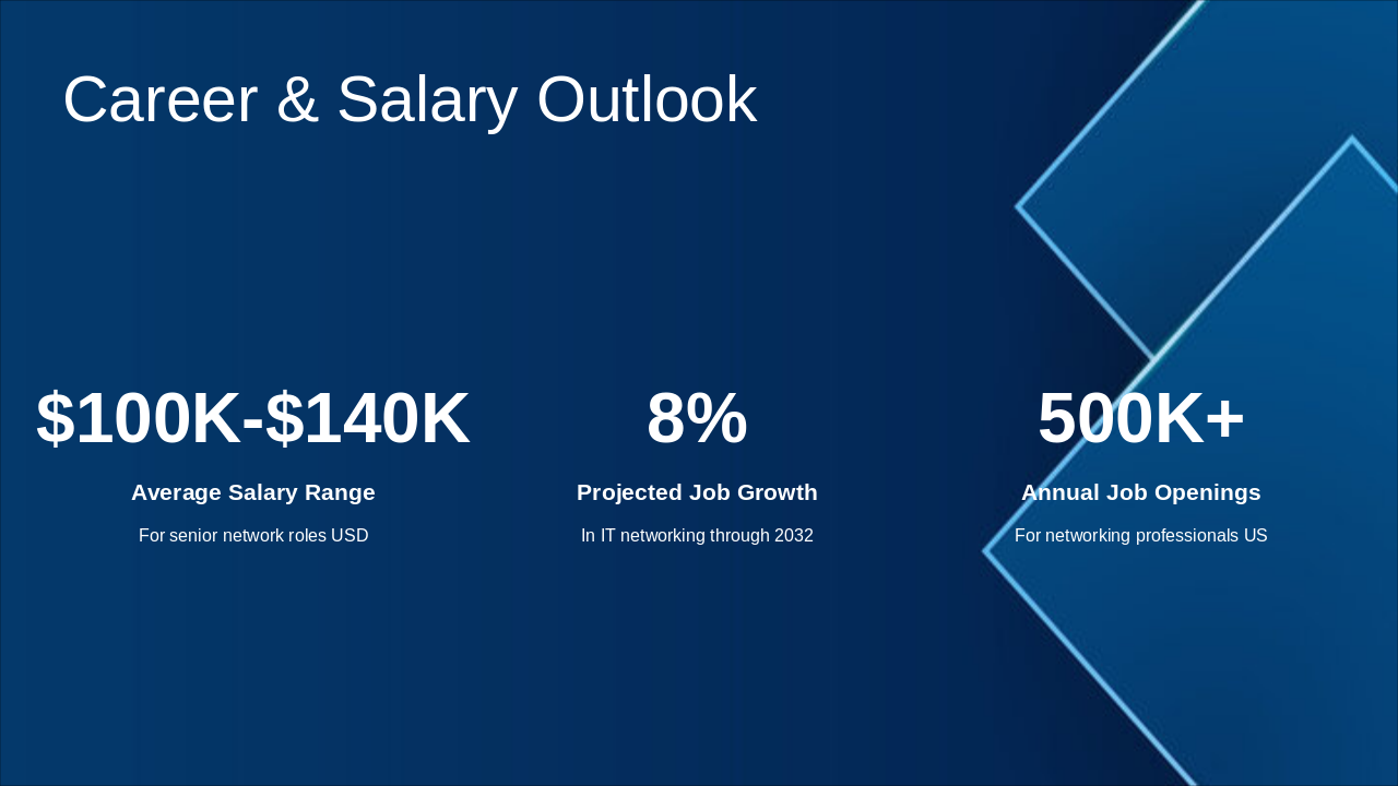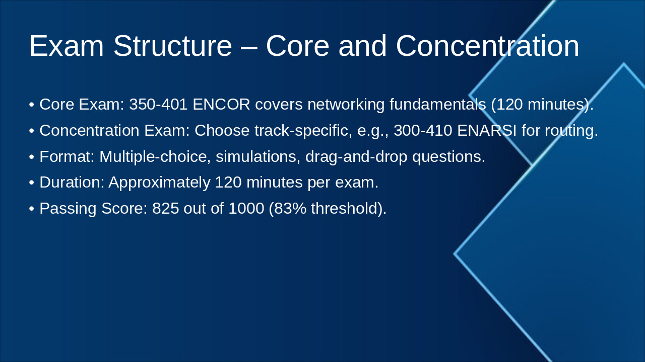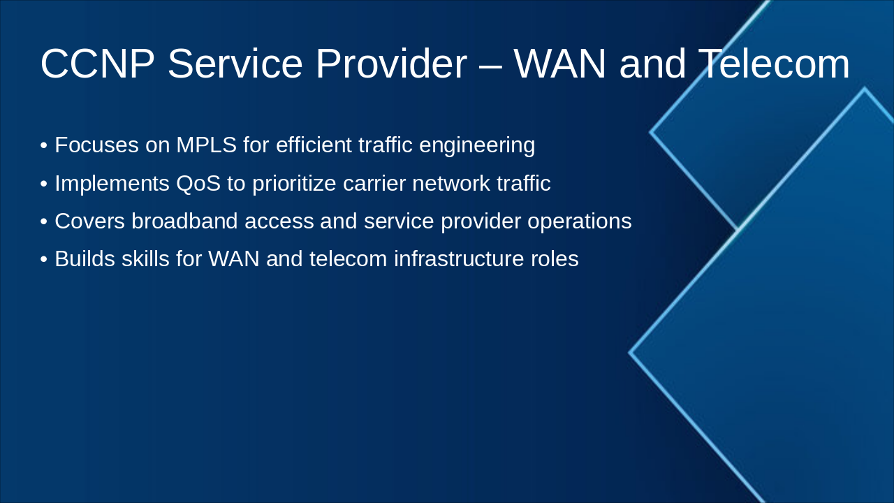 | Focuses on advanced enterprise networking: routing protocols (OSPF, BGP, EIGRP), automation with Python and APIs, and security implementation including VPNs and firewalls. Builds expertise for scalable, secure infrastructures. | Leads to roles like Network Engineer and Solutions Architect. Key skills include enterprise troubleshooting, scalable design, and secure connectivity management in large organizations. |