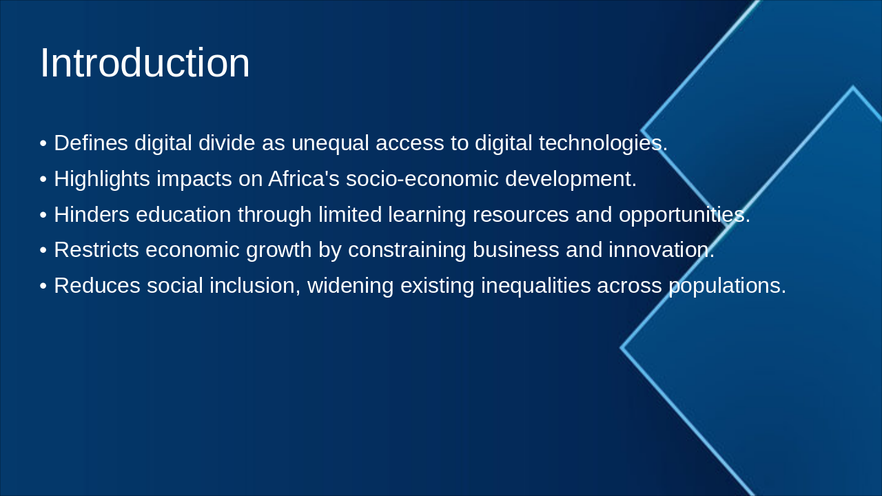 The title slide introduces the topic "Digital Access Inequalities: A Case Study – Africa," focusing on disparities in digital access across the continent. It features an academic exploration of the digital divide authored by Nada Abassi.