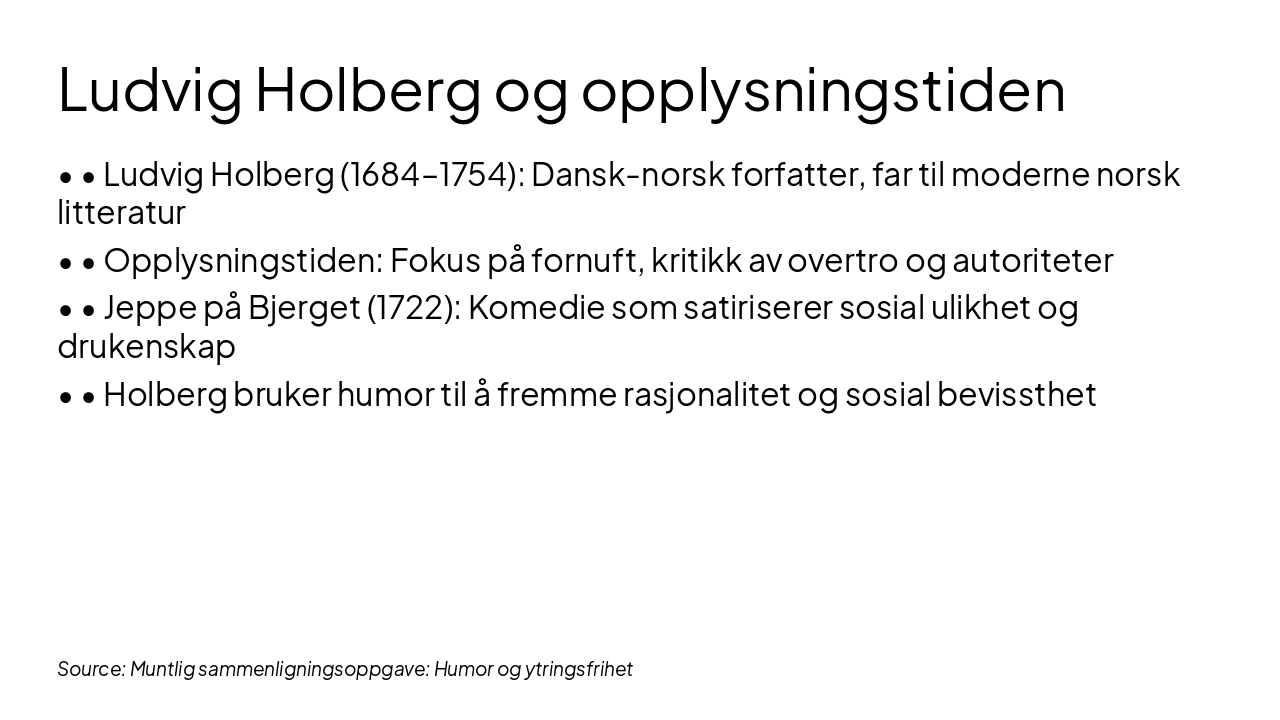The title slide is titled "Humor og ytringsfrihet" and presents the topic "Jeppe på Bjerget og en samtidstekst." It includes a placeholder for the presenter's name and indicates it's for Norwegian upper secondary school (Norsk videregående).