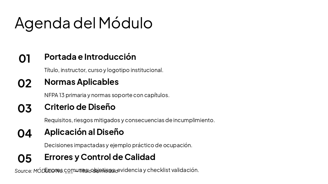 Esta es la diapositiva de portada titulada "Portada". Muestra el título "MÓDULO No. — Título del módulo" y el subtítulo "Instructor: [Nombre] | Diseño de Sistemas Contra Incendio (Nivel Básico)".
