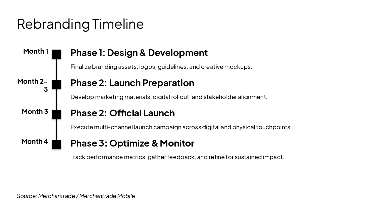 Month 1: Phase 1: Design & Development Finalize branding assets, logos, guidelines, and creative mockups. Month 2-3: Phase 2: Launch Preparation Develop marketing materials, digital rollout, and stakeholder alignment. Month 3: Phase 2: Official Launch Execute multi-channel launch campaign across digital and physical touchpoints. Month 4: Phase 3: Optimize & Monitor Track performance metrics, gather feedback, and refine for sustained impact.