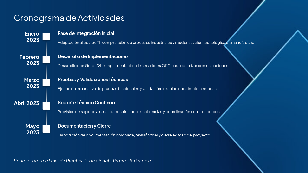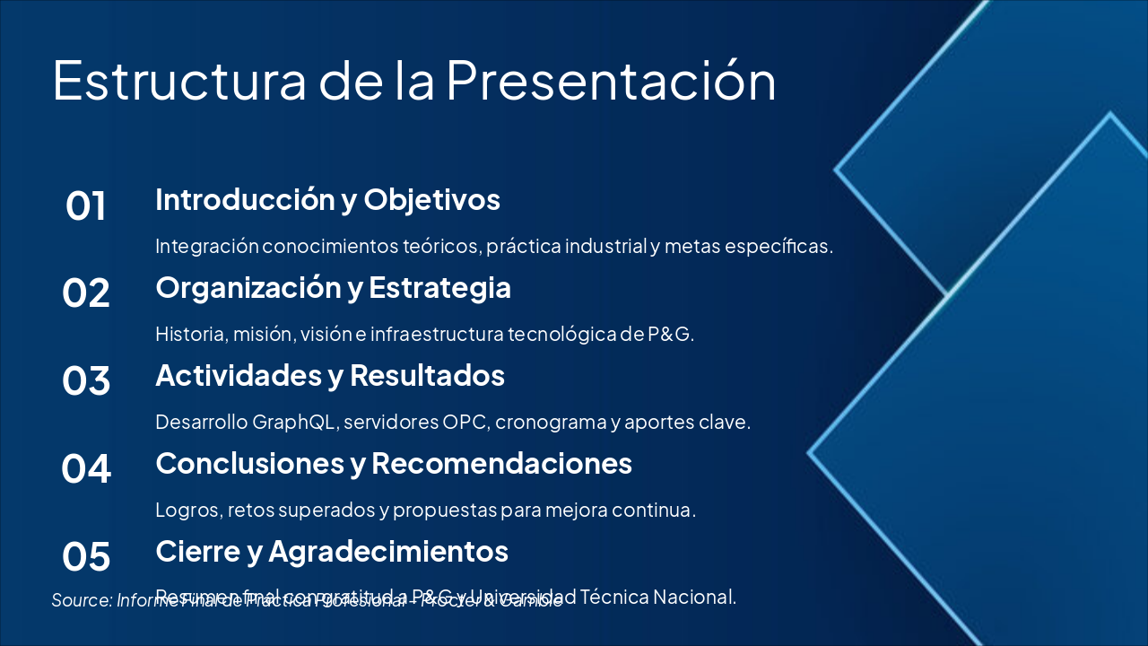 This title slide, labeled "Portada," displays the main heading "Informe Final de Práctica Profesional." The subtitle lists "Procter & Gamble / Universidad Técnica Nacional (UTN)."