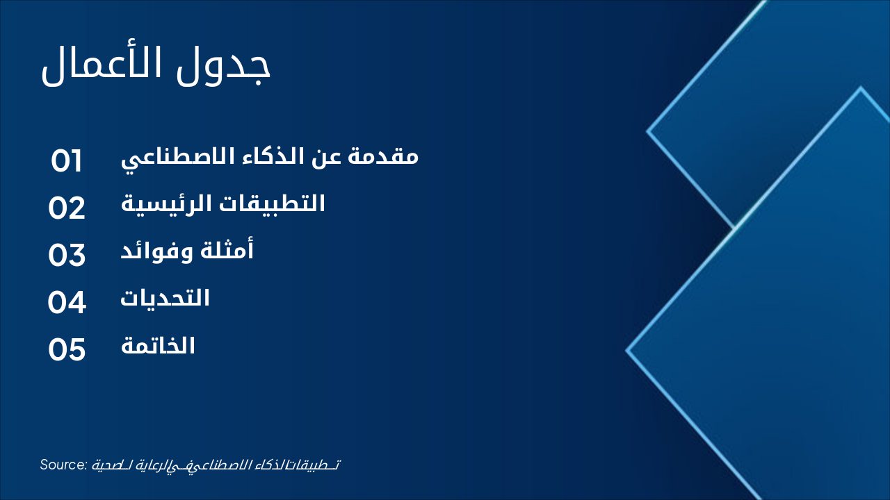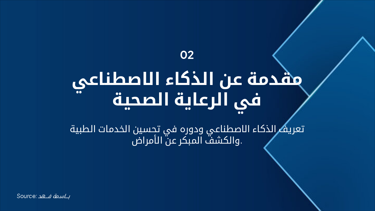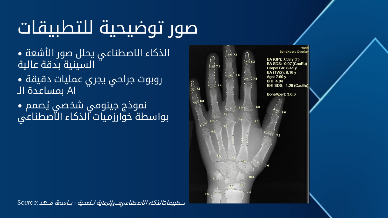 { "features": [ { "icon": "🩺", "heading": "التشخيص الطبي", "description": "تحليل الصور الطبية بدقة عالية لكشف الأمراض مبكراً ودعم الأطباء." }, { "icon": "💊", "heading": "اكتشاف الأدوية", "description": "تسريع اكتشاف الأدوية الجديدة عبر محاكاة التفاعلات الكيميائية المتقدمة." }, { "icon": "🧬", "heading": "الطب الشخصي", "description": "تصميم علاجات مخصصة بناءً على الجينوم والخصائص الشخصية للمريض." }, { "icon": "🤖", "heading": "الروبوتات الجراحية", "description": "مساعدة الجراحين بعمليات دقيقة وحد أدنى من الأخطاء البشرية." }, { "icon": "📊", "heading": "إدارة السجلات", "description": "تنظيم وتحليل السجلات الطبية للوصول السريع وتحسين الرعاية." } ] }