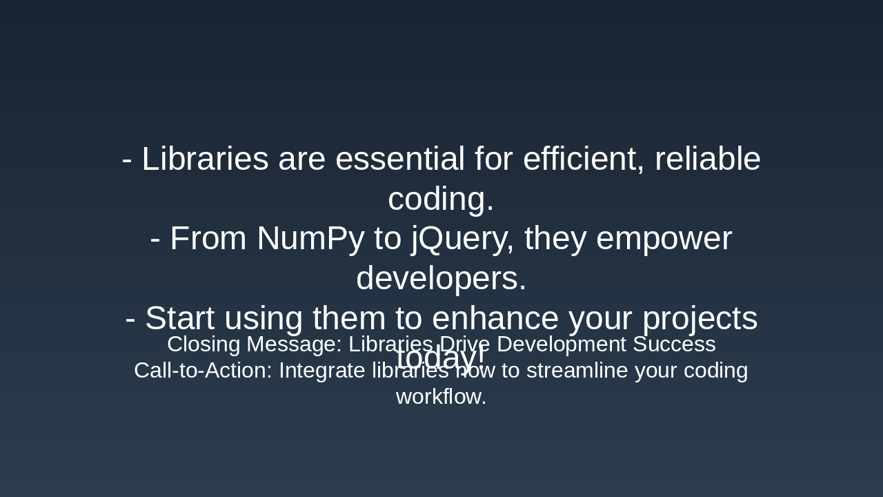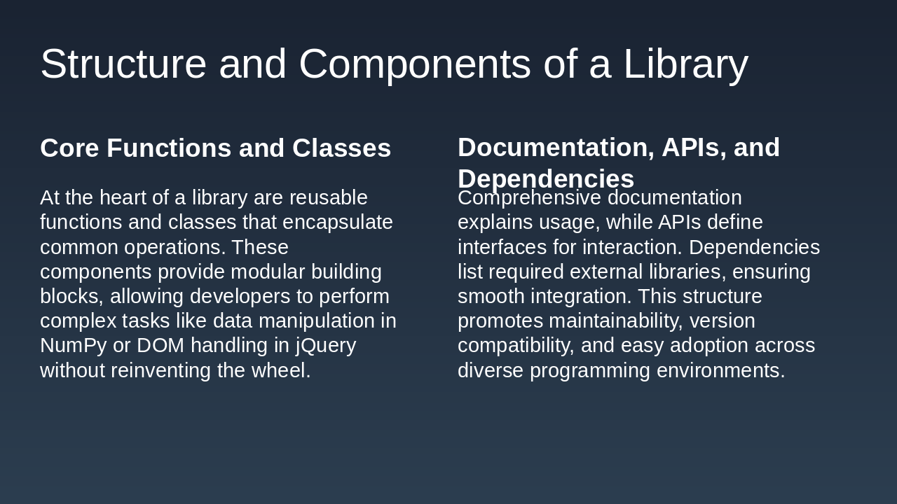 - Examples: NumPy for mathematical operations, jQuery for web development.
