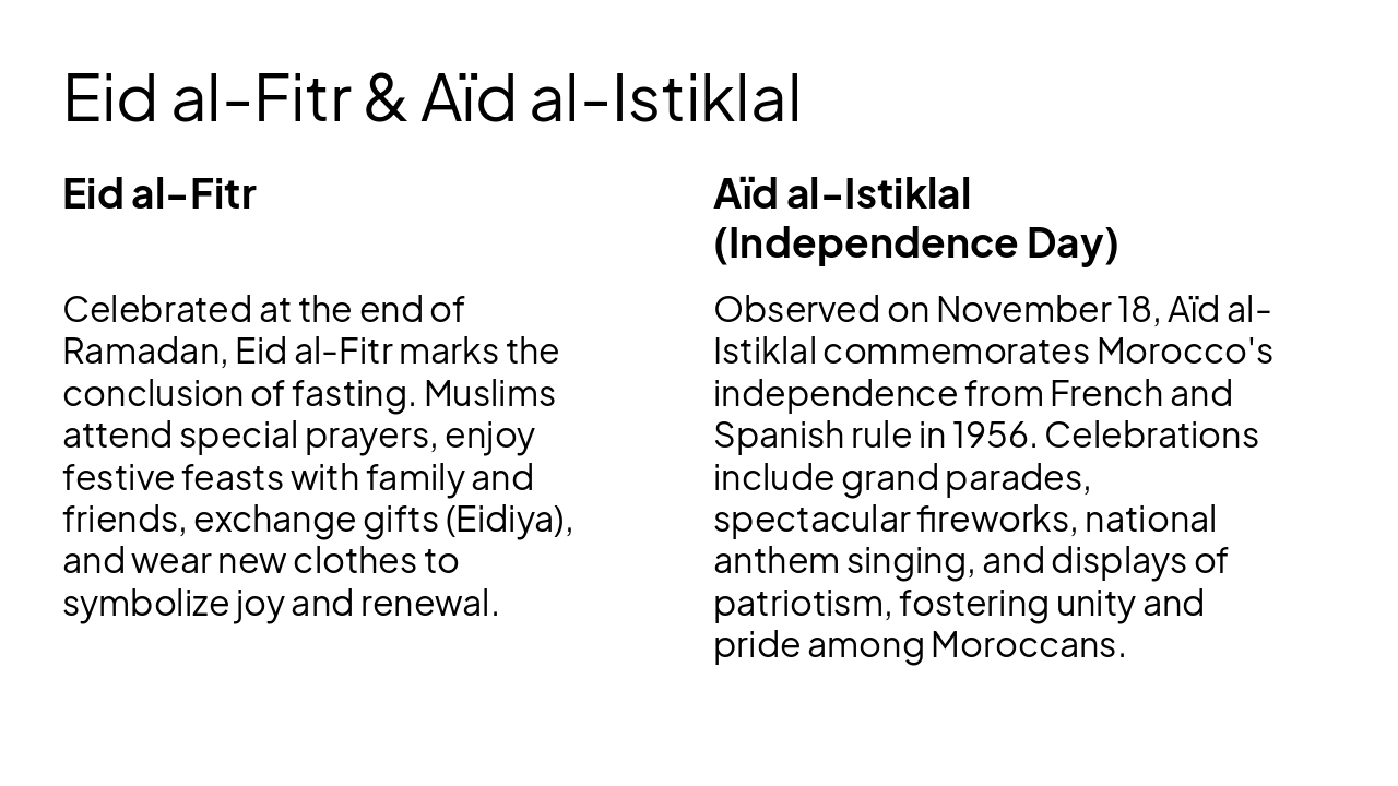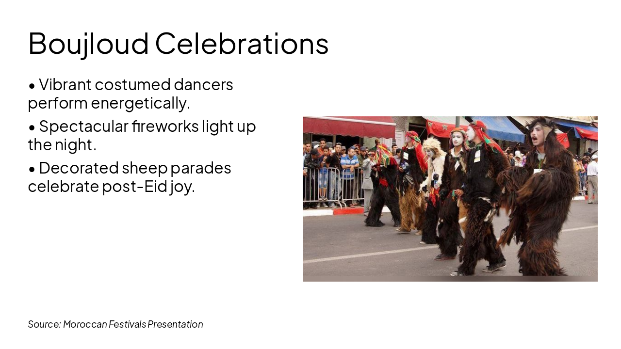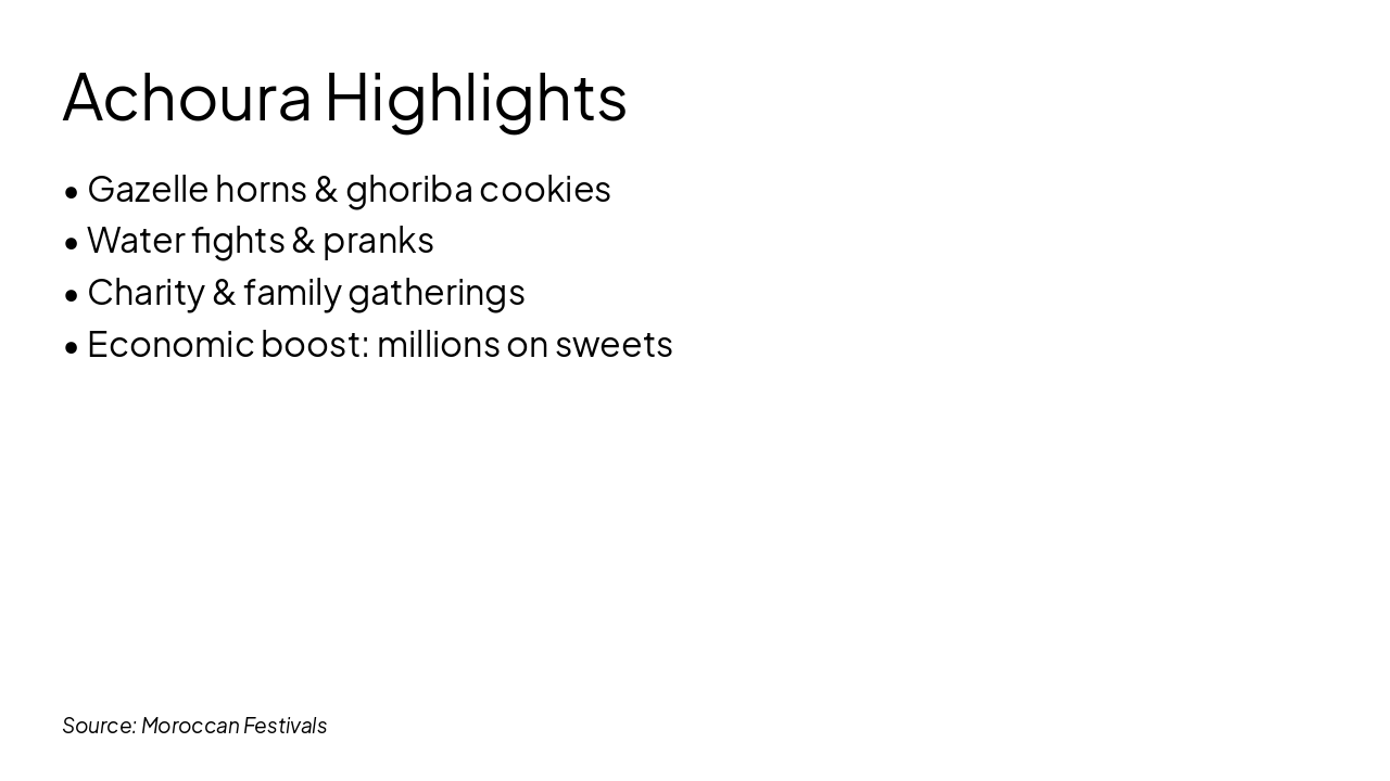 End of Ramadan: Eid Fitr Marks Ramadan's End End-of-fast celebrations boost retail with feasting, gifts, and family gatherings across Morocco. Summer: Boujloud Festival Features Sheep Parades Summer event draws tourists, stimulating local commerce, handicrafts, and hospitality sectors vibrantly. October/November: Achoura Ushers in Fall Traditions Post-Ashura festivities increase demand for sweets, rituals, and community events seasonally. November 18: Istiklal Day Honors National Independence Patriotic holiday sparks events, markets, and gatherings enhancing business in urban areas.