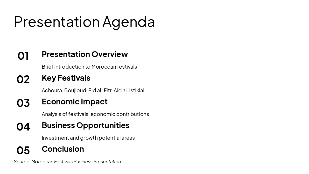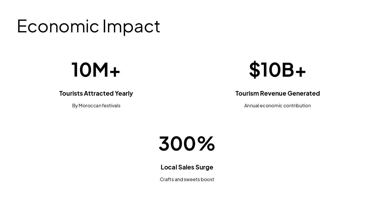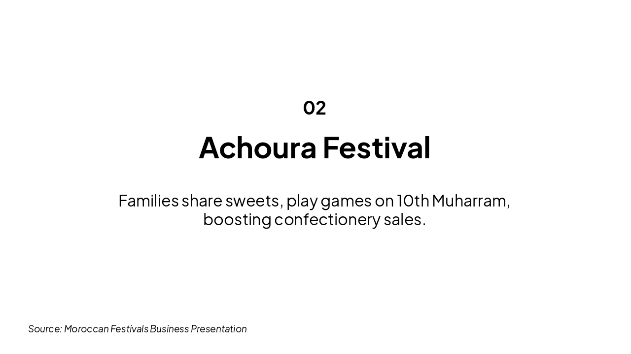 The Festival Calendar timeline highlights four key Moroccan events: Eid Fitr at Ramadan's end boosting retail with feasting and gifts; summer's Boujloud Festival drawing tourists to commerce and crafts; Achoura in fall increasing sweets and rituals; and November 18's Istiklal Day sparking urban markets. Each festival emphasizes economic impacts on local business, hospitality, and community gatherings.