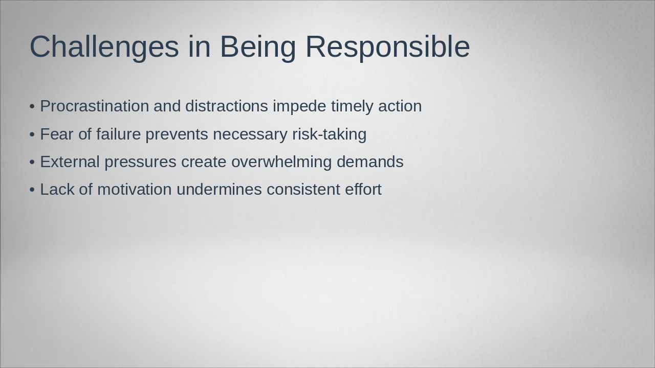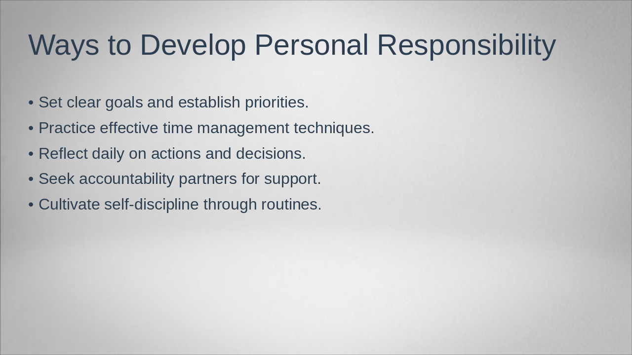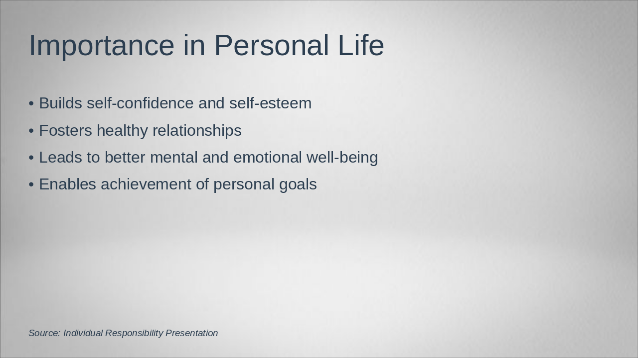 This title slide, named "Individual Responsibility," features the main text "Cultivating Individual Responsibility." Its subtitle outlines an exploration of its essence, importance, elements, benefits, challenges, and cultivation.
