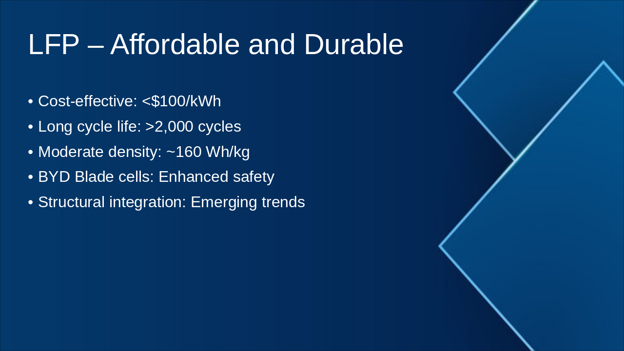 - LFP: Cost/durability champion