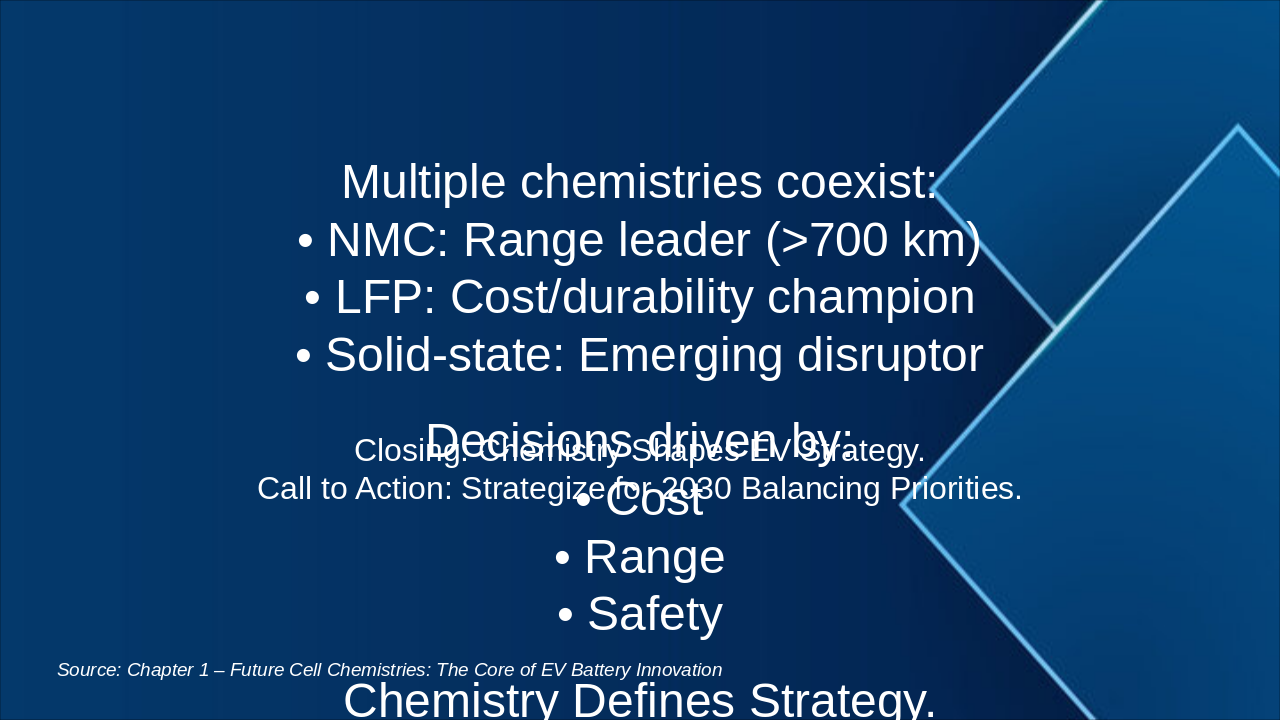 Closing: Chemistry Shapes EV Strategy. Call to Action: Strategize for 2030 Balancing Priorities.