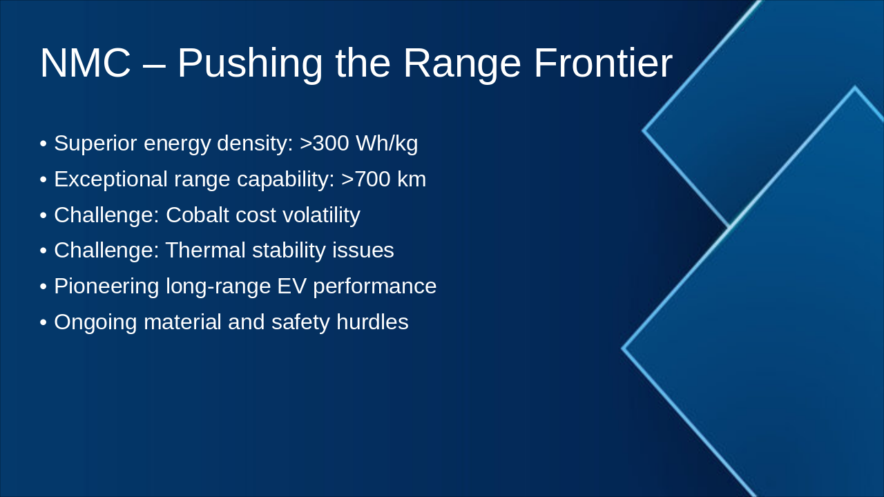 - NMC: Range leader (>700 km)