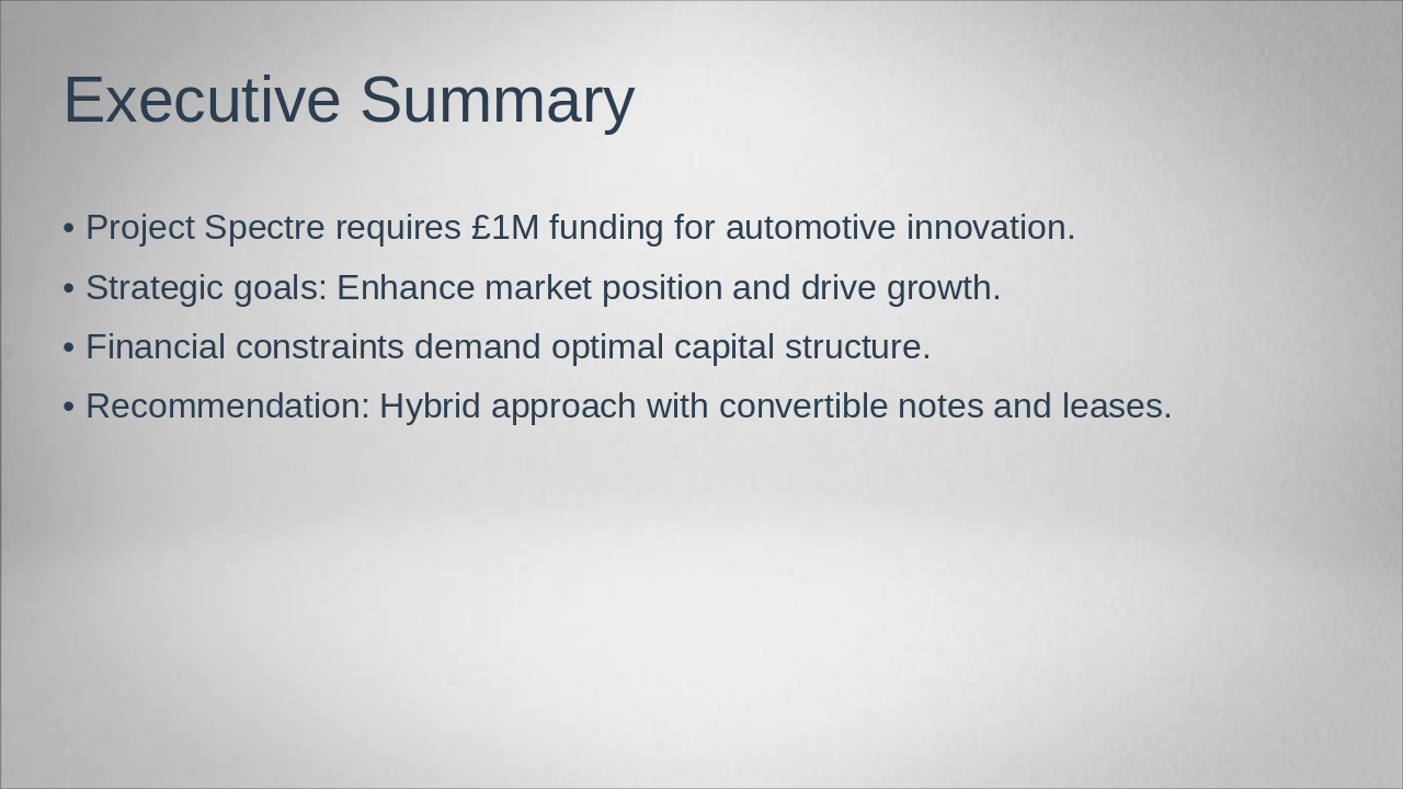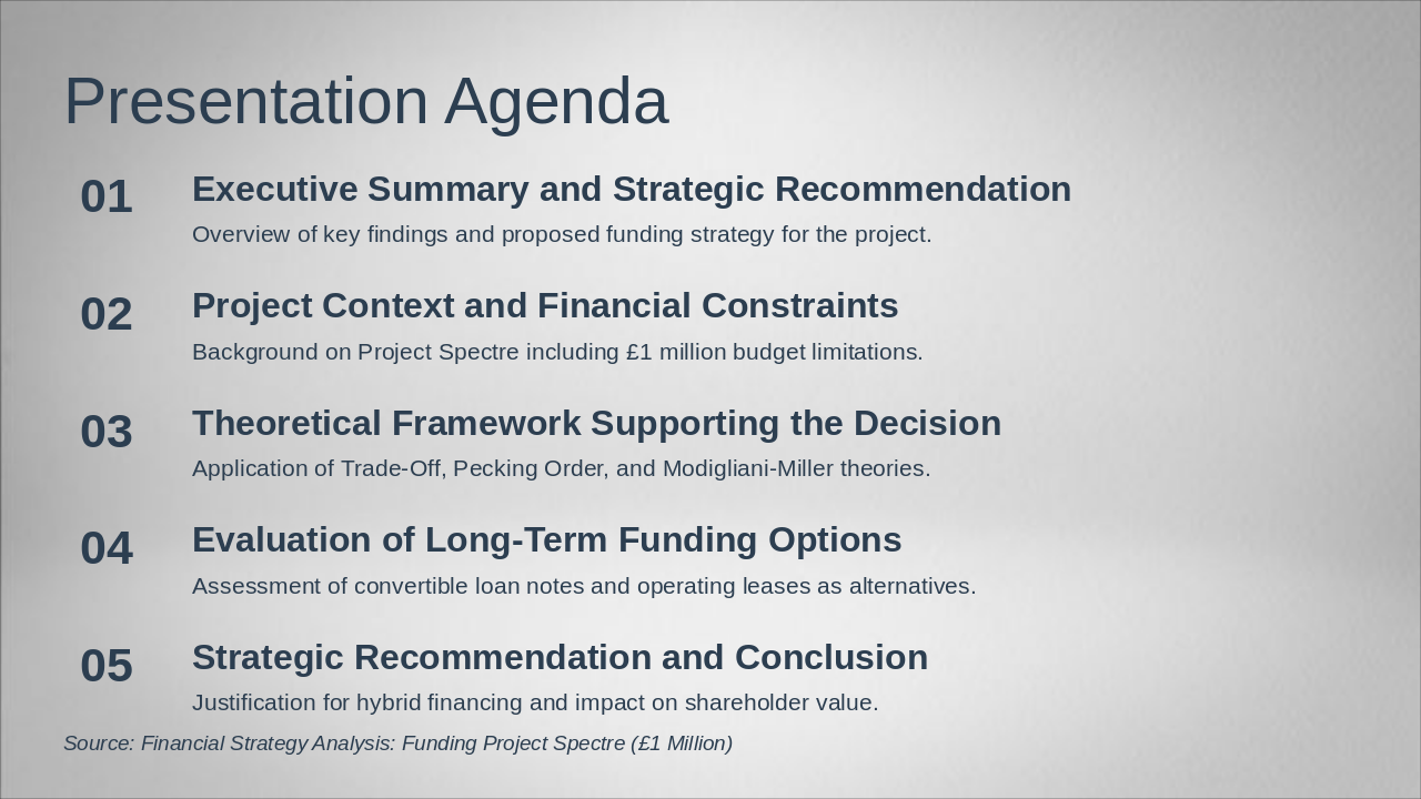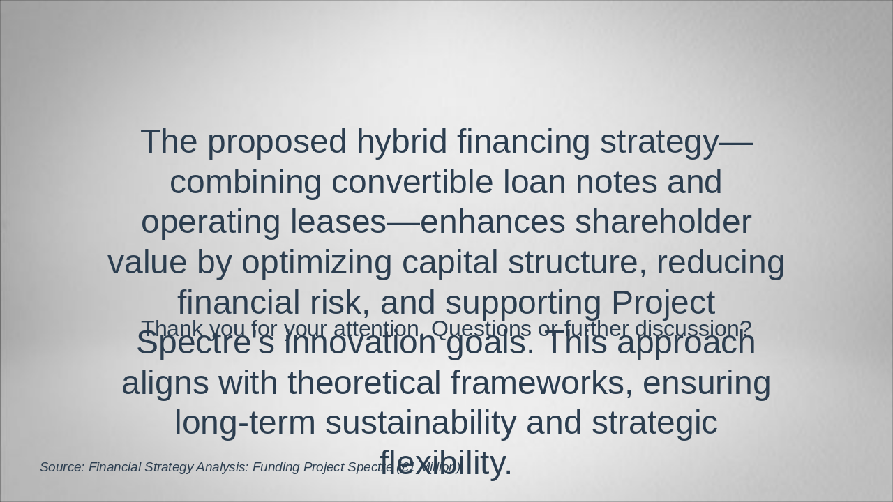 The proposed hybrid financing strategy, which combines convertible loan notes and operating leases, boosts shareholder value by optimizing capital structure, lowering financial risk, and advancing Project Spectre's innovation objectives, while aligning with theoretical frameworks for long-term sustainability and flexibility. The slide concludes with thanks for the attention and an invitation for questions or further discussion.