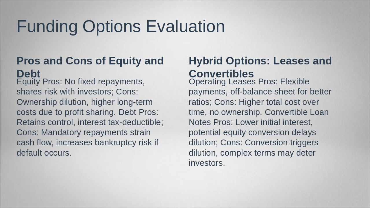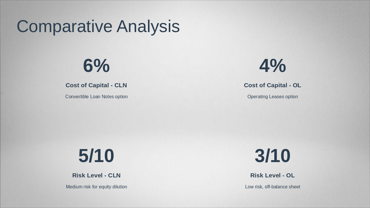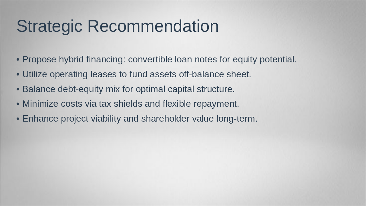 The proposed hybrid financing strategy—combining convertible loan notes and operating leases—enhances shareholder value by optimizing capital structure, reducing financial risk, and supporting Project Spectre's innovation goals. This approach aligns with theoretical frameworks, ensuring long-term sustainability and strategic flexibility.