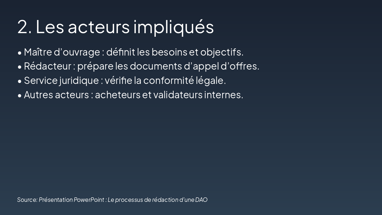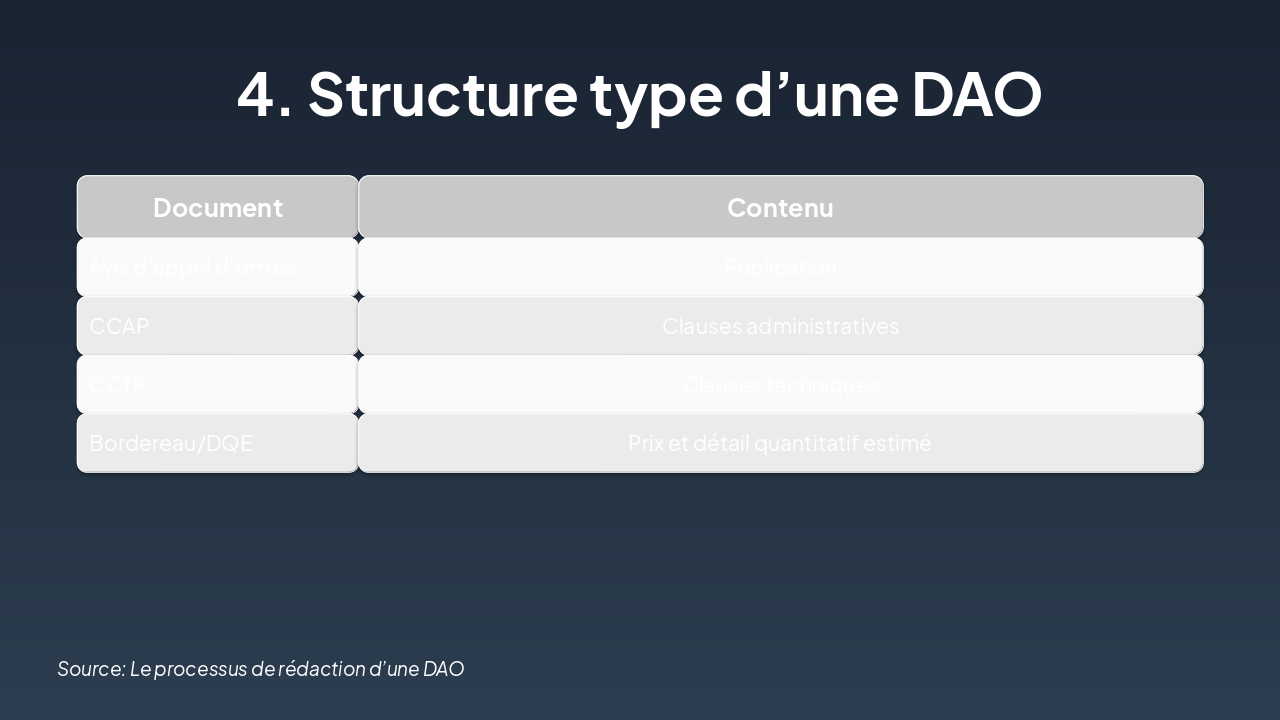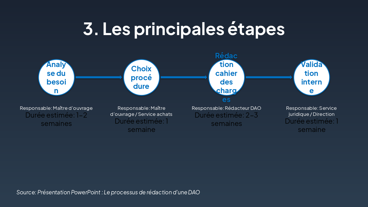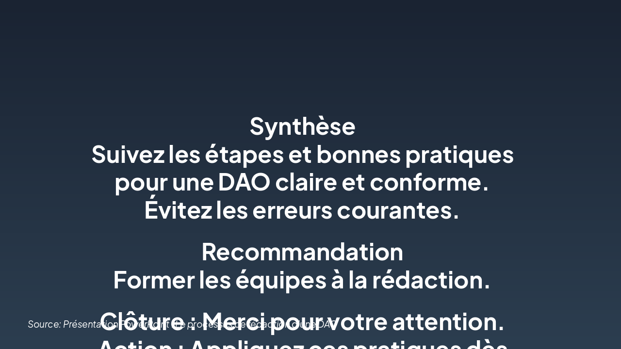 Synthèse des points clés et recommandations. Source: Présentation PowerPoint : Le processus de rédaction d’une DAO
