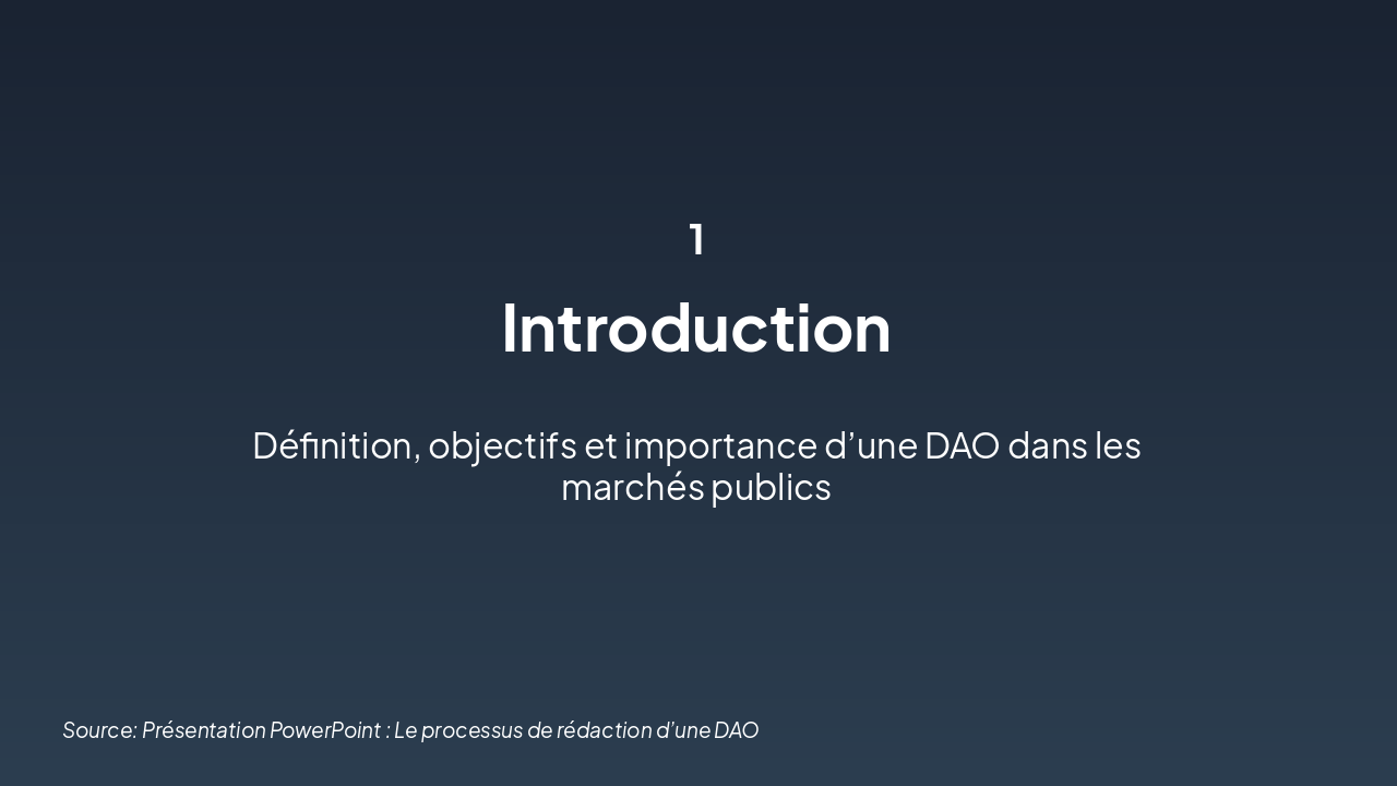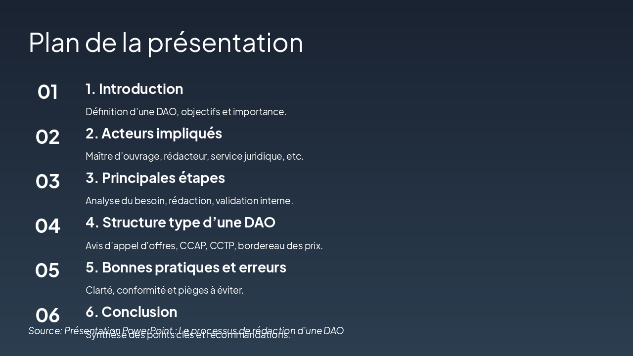 Ce plan de présentation sur les DAO (Dossiers d'Appel d'Offres) couvre six points principaux : de l'introduction définissant les objectifs à la conclusion avec synthèse et recommandations. Il détaille les acteurs impliqués, les étapes clés, la structure type et les bonnes pratiques à adopter pour éviter les erreurs.