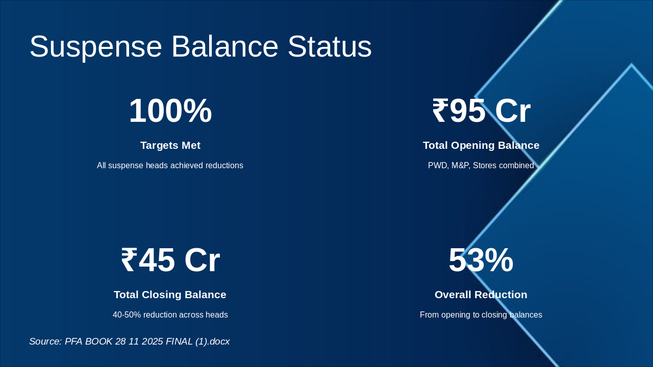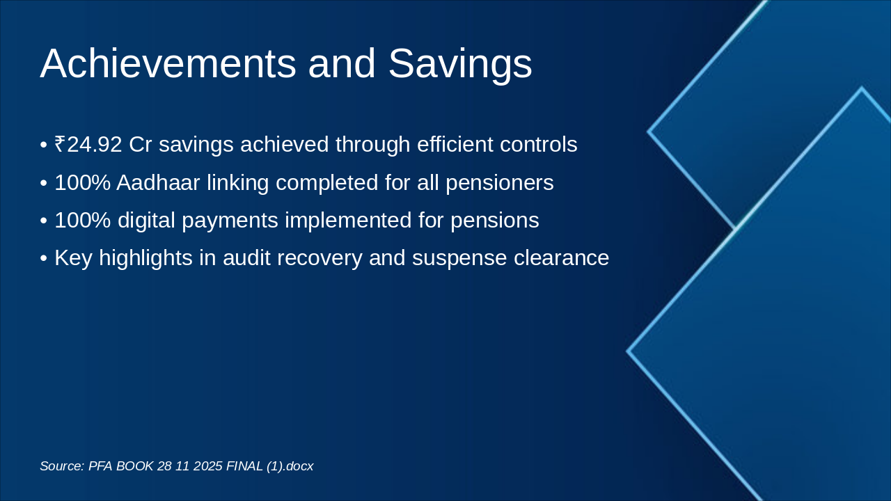 <ul><li><strong>Key Achievements:</strong> ₹24.92 Cr Savings, Enhanced Pension Processes</li><li><strong>Challenges Ahead:</strong> Addressing Vacancies & Pending Audits</li><li><strong>Way Forward:</strong> Zero Vacancy | 100% Audit Clearance</li></ul><p><em>Closing Message: Excellence Achieved, Future Secured.</em> (4 words)</p><p><strong>Call to Action:</strong> Collaborate for zero vacancy and full audit compliance. (7 words)</p><p>Thank You!</p>