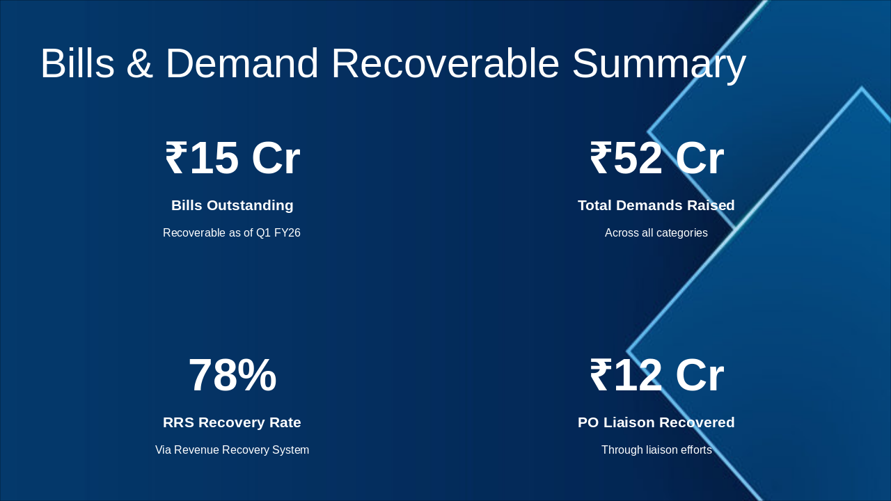 Summarize achievements like ₹24.92 Cr savings; highlight challenges (vacancies, audits); emphasize goals: zero vacancy, 100% audit clearance. End with thanks and Q&A.