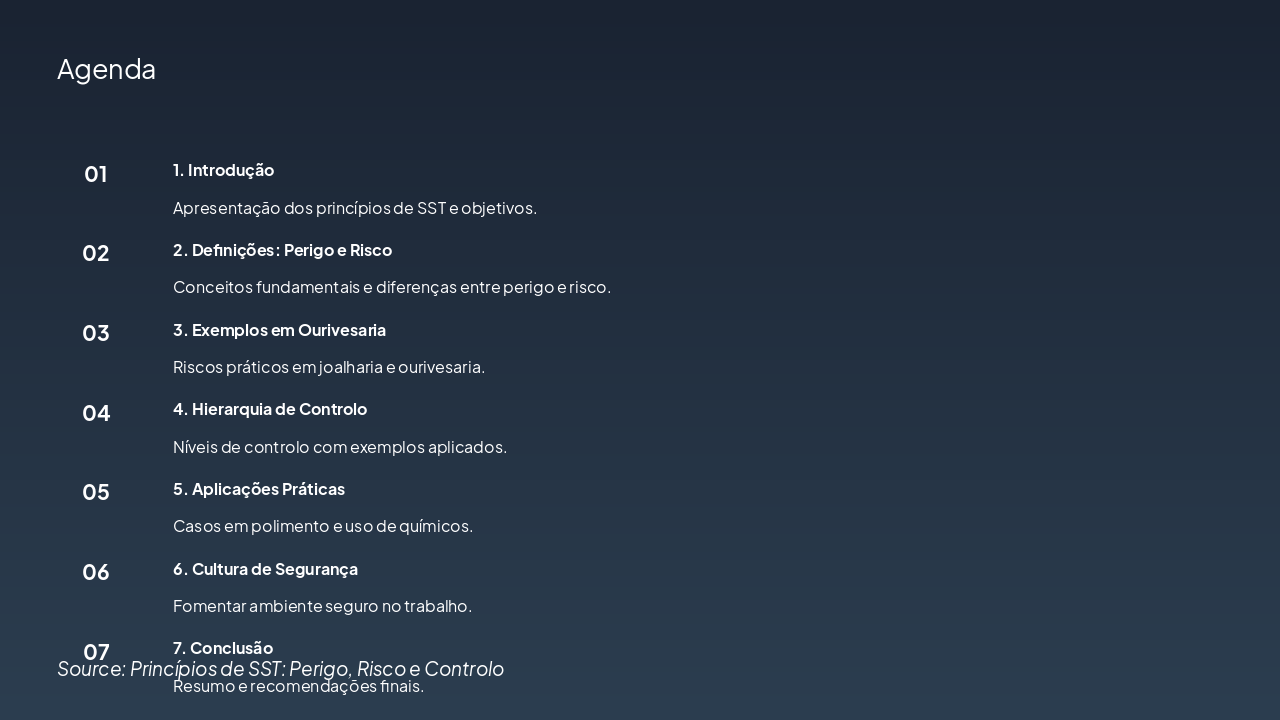 A agenda apresenta uma sessão sobre Segurança e Saúde no Trabalho (SST) em ourivesaria, iniciando com introdução aos princípios e objetivos, seguida de definições de perigo e risco com exemplos práticos. Prossegue com hierarquia de controlo, aplicações em polimento e químicos, cultura de segurança, e termina em conclusão com recomendações.