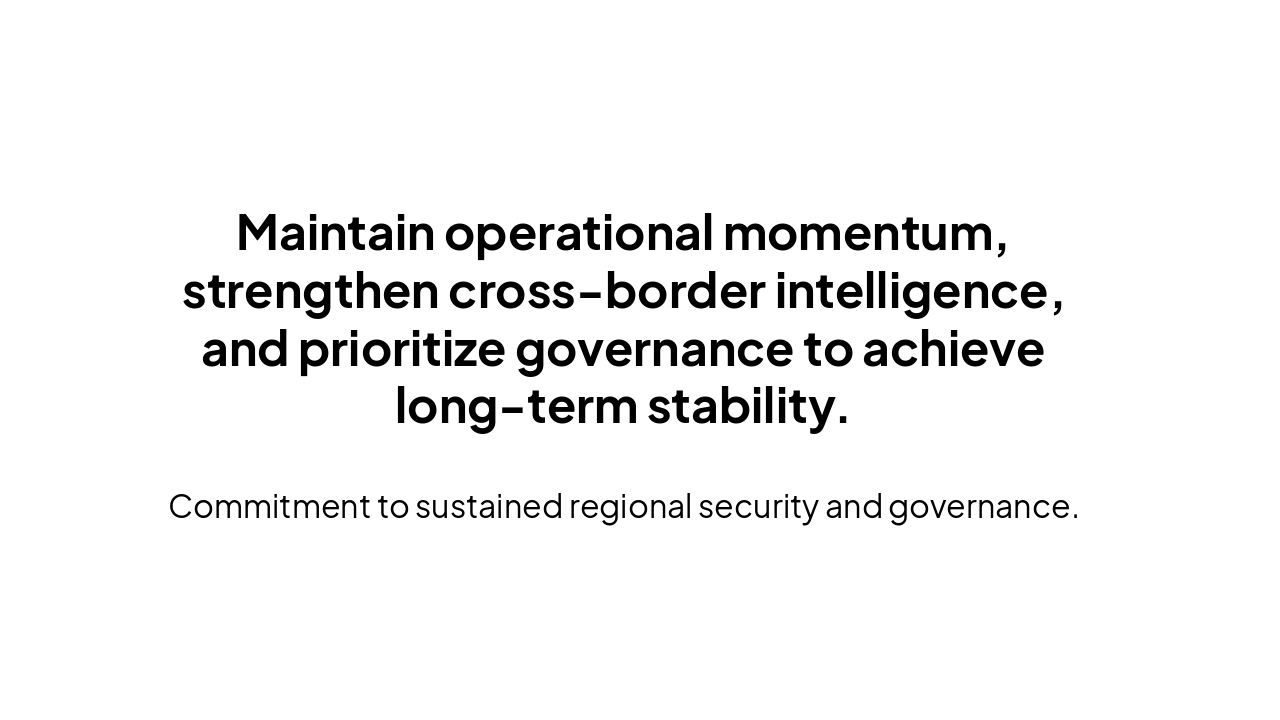Maintain operational momentum, strengthen cross-border intelligence, and prioritize governance to achieve long-term stability.