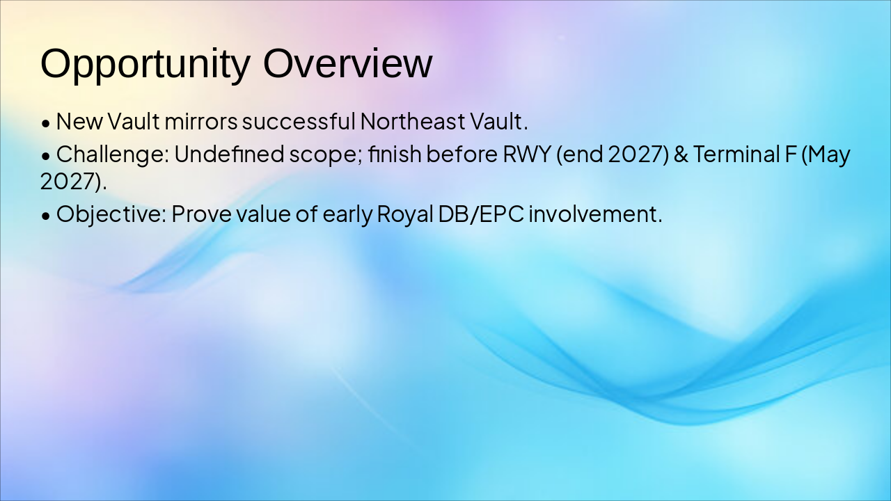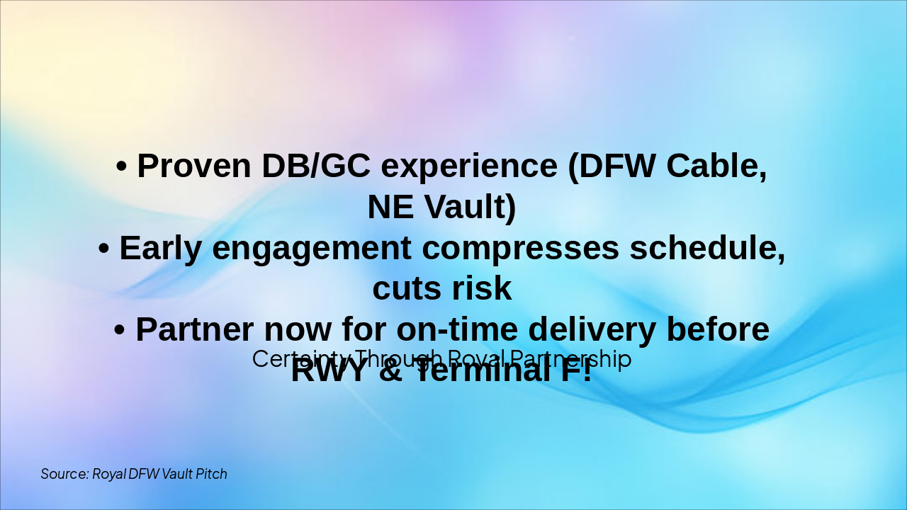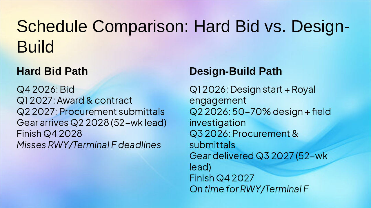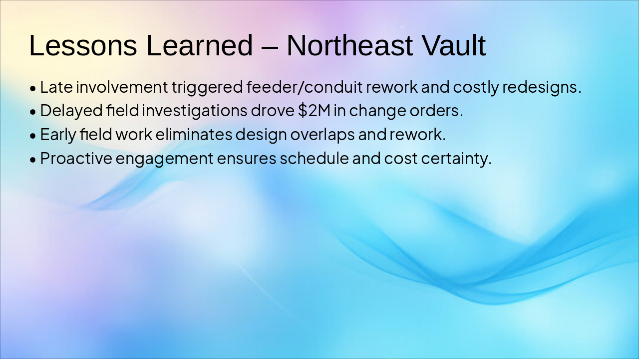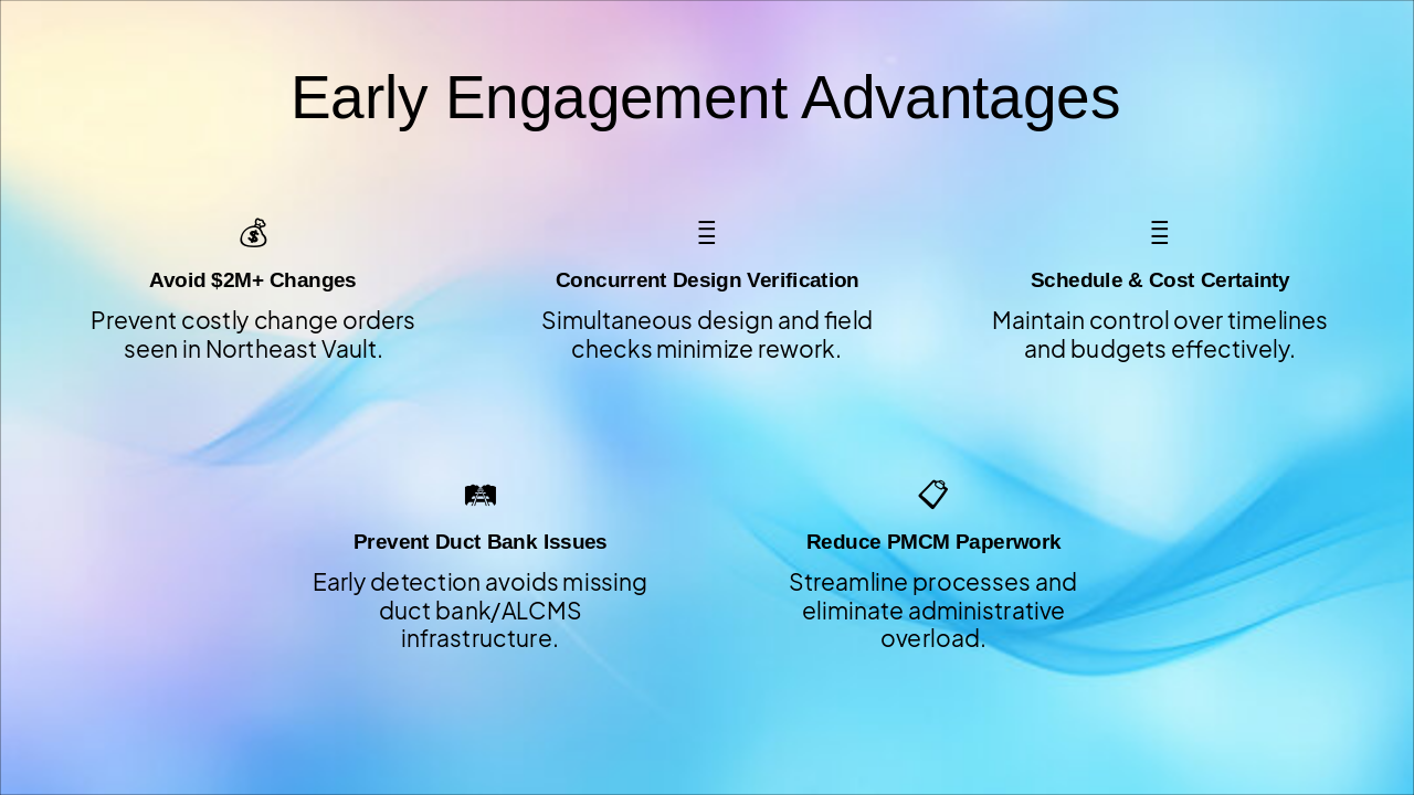 { "features": [ { "icon": "💰", "heading": "Avoid $2M+ Changes", "description": "Prevent costly change orders seen in Northeast Vault." }, { "icon": "🔄", "heading": "Concurrent Design Verification", "description": "Simultaneous design and field checks minimize rework." }, { "icon": "🎯", "heading": "Schedule & Cost Certainty", "description": "Maintain control over timelines and budgets effectively." }, { "icon": "🛤️", "heading": "Prevent Duct Bank Issues", "description": "Early detection avoids missing duct bank/ALCMS infrastructure." }, { "icon": "📋", "heading": "Reduce PMCM Paperwork", "description": "Streamline processes and eliminate administrative overload." } ] }