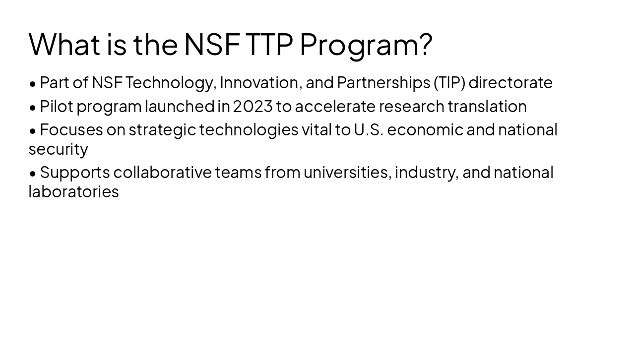 I would like to create a intro presentation for NSF translation to practice (TTP) program describing goals, overview, description of each track, eligibility, application process, etc.