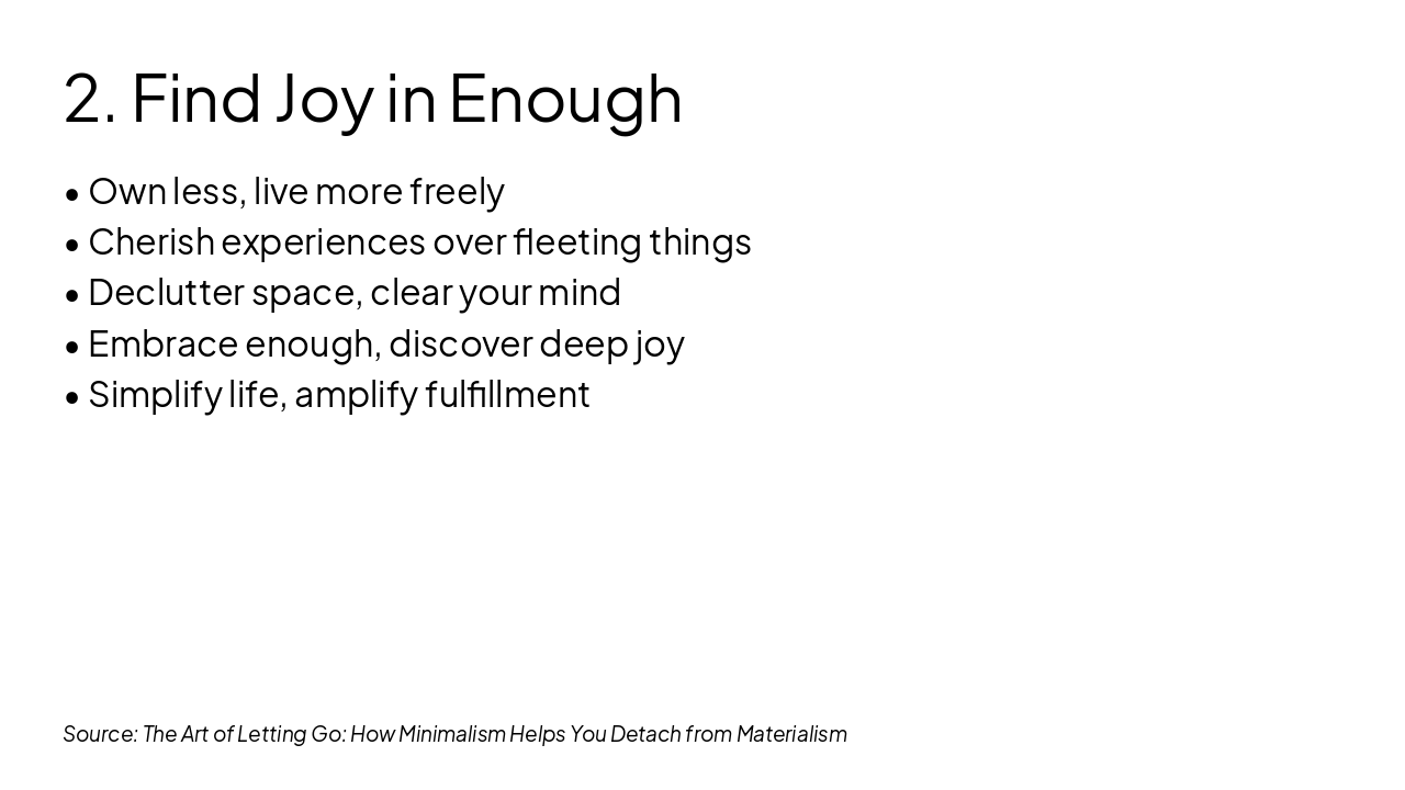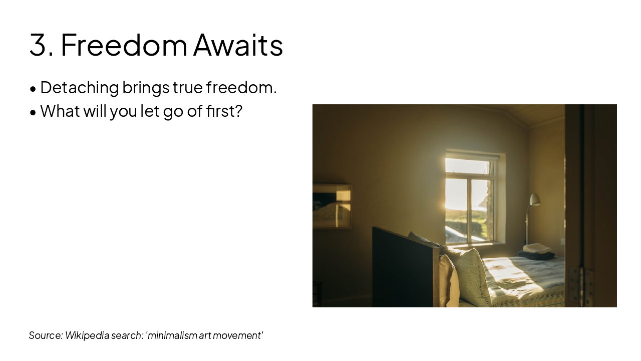 The slide titled "The Art of Letting Go" features a subtitle explaining how minimalism aids in detaching from materialism. It encourages embracing freedom through simplicity.