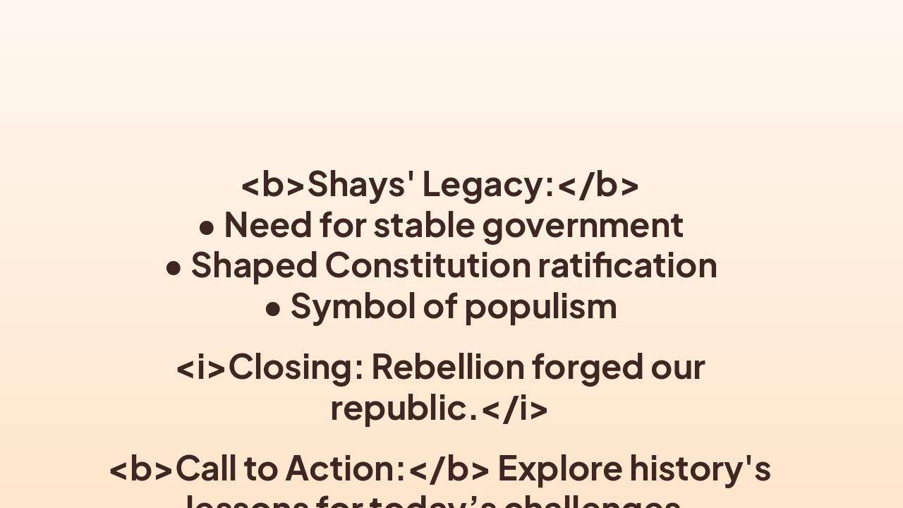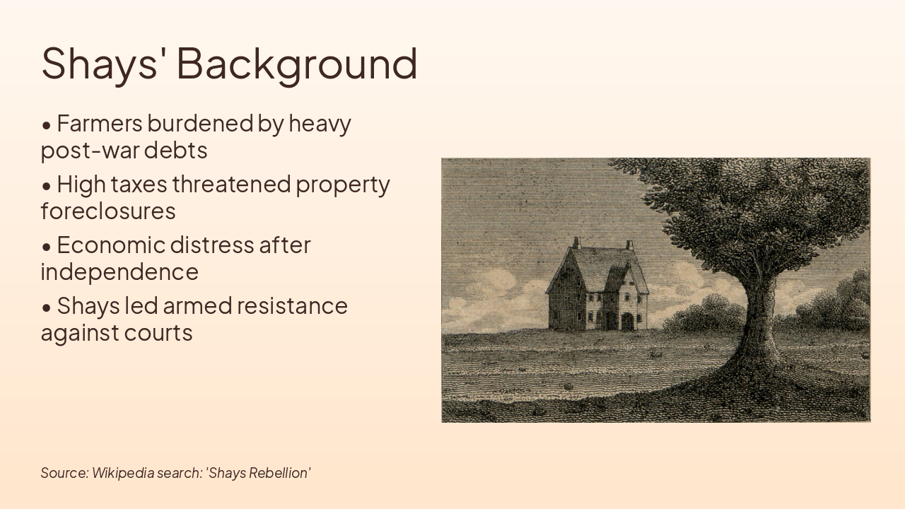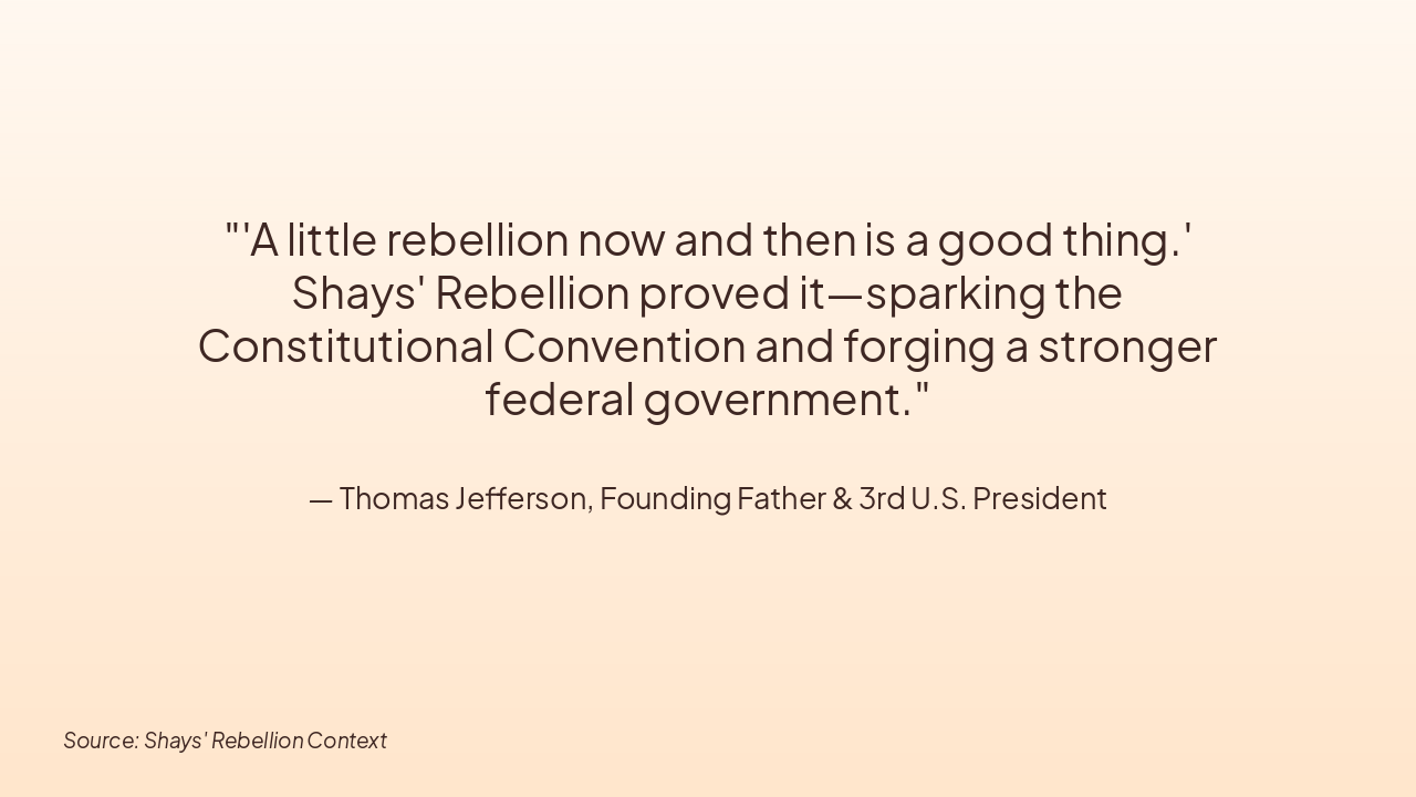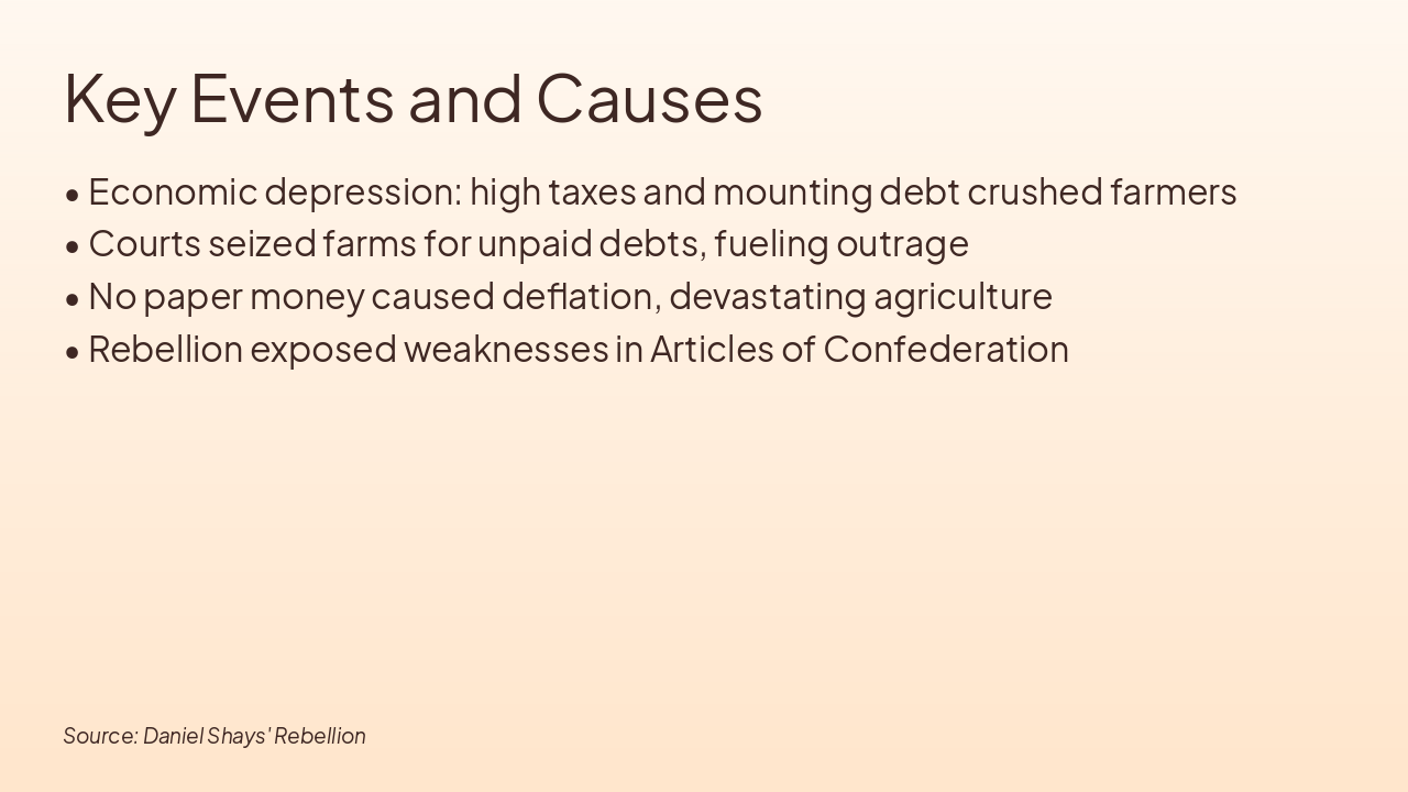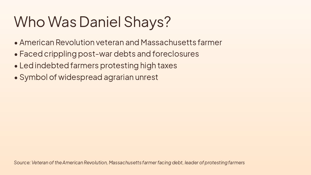 Daniel Shays led farmers in protests against debts and courts, highlighting post-Revolutionary economic woes. Use brown tones and images of period protests, farms, and militias.
