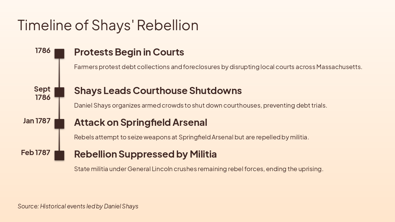 1786: Protests Begin in Courts Farmers protest debt collections and foreclosures by disrupting local courts across Massachusetts. Sept 1786: Shays Leads Courthouse Shutdowns Daniel Shays organizes armed crowds to shut down courthouses, preventing debt trials. Jan 1787: Attack on Springfield Arsenal Rebels attempt to seize weapons at Springfield Arsenal but are repelled by militia. Feb 1787: Rebellion Suppressed by Militia State militia under General Lincoln crushes remaining rebel forces, ending the uprising.