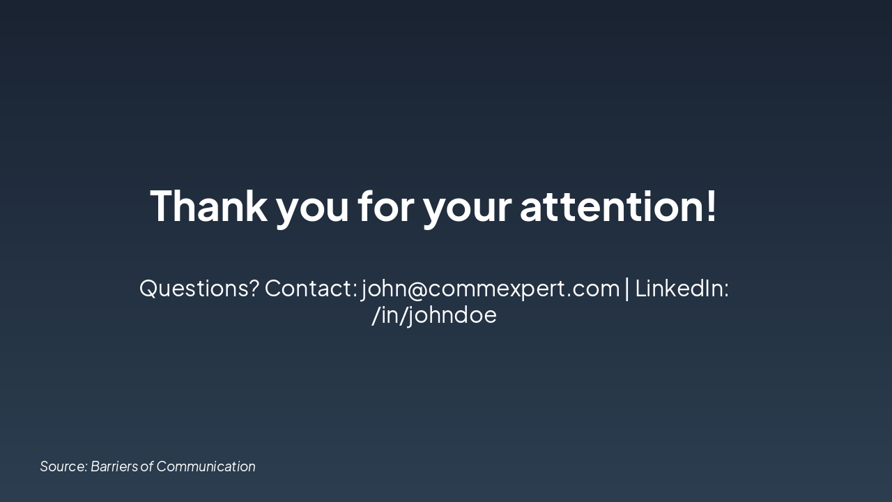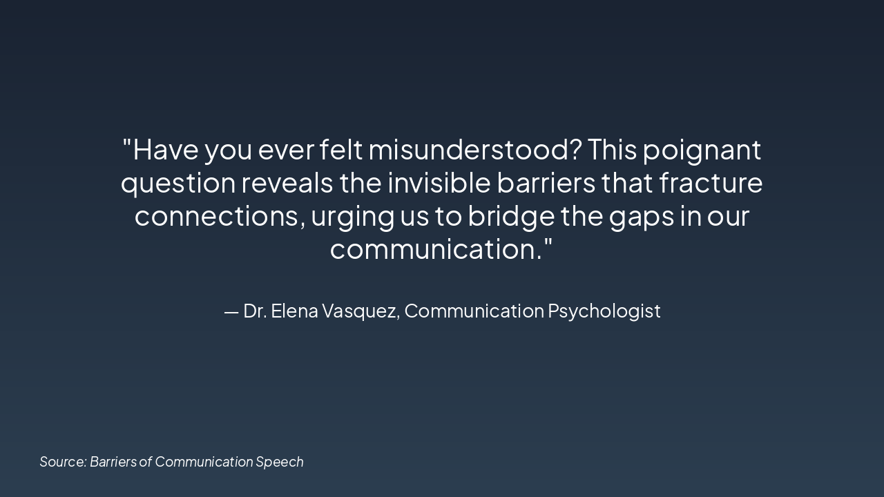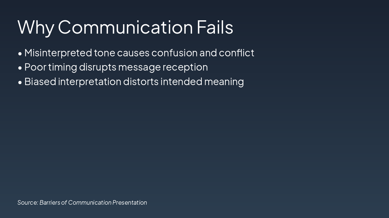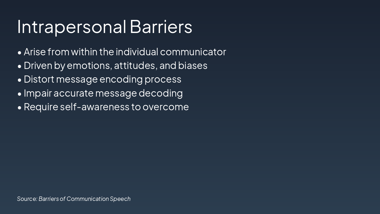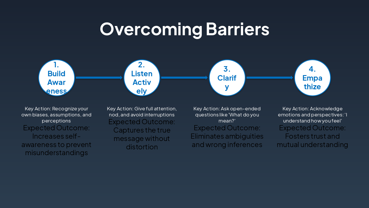 The slide presents a four-step workflow titled "Overcoming Barriers," with steps including Build Awareness (recognize biases), Listen Actively (give full attention), Clarify (ask open-ended questions), and Empathize (acknowledge emotions). Each step details a key action and its expected outcome, such as preventing misunderstandings and fostering trust.