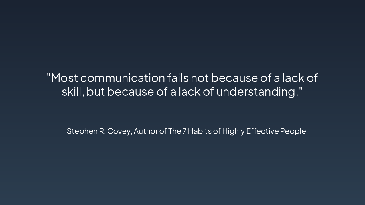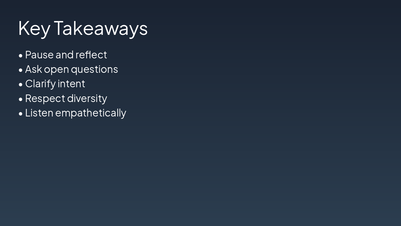 { "headers": [ "Step", "Key Action", "Expected Outcome" ], "rows": [ [ "1. Build Awareness", "Recognize your own biases, assumptions, and perceptions", "Increases self-awareness to prevent misunderstandings" ], [ "2. Listen Actively", "Give full attention, nod, and avoid interruptions", "Captures the true message without distortion" ], [ "3. Clarify", "Ask open-ended questions like 'What do you mean?'", "Eliminates ambiguities and wrong inferences" ], [ "4. Empathize", "Acknowledge emotions and perspectives: 'I understand how you feel'", "Fosters trust and mutual understanding" ] ] }