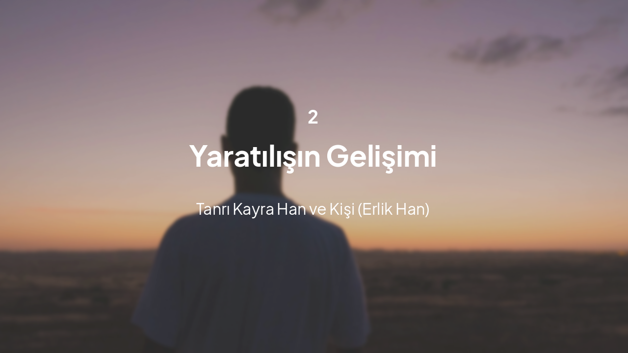 Yaratıcı Güç Tanrı Kayra Han, bu sonsuz kaosun içinde tek başına var olan yüce güçtü. Yarattığı her şeyden önce o vardı.