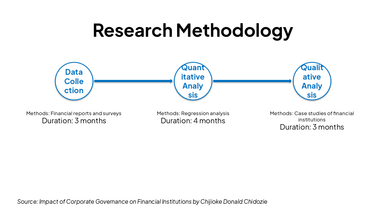 The Research Methodology workflow slide outlines three sequential phases with their methods and durations. It covers Data Collection using financial reports and surveys (3 months), Quantitative Analysis via regression analysis (4 months), and Qualitative Analysis through case studies of financial institutions (3 months).
