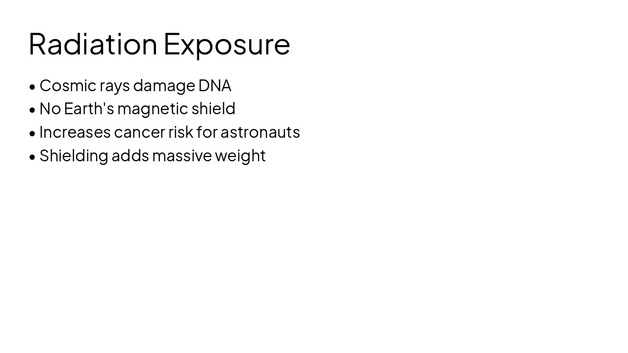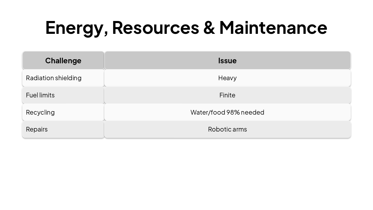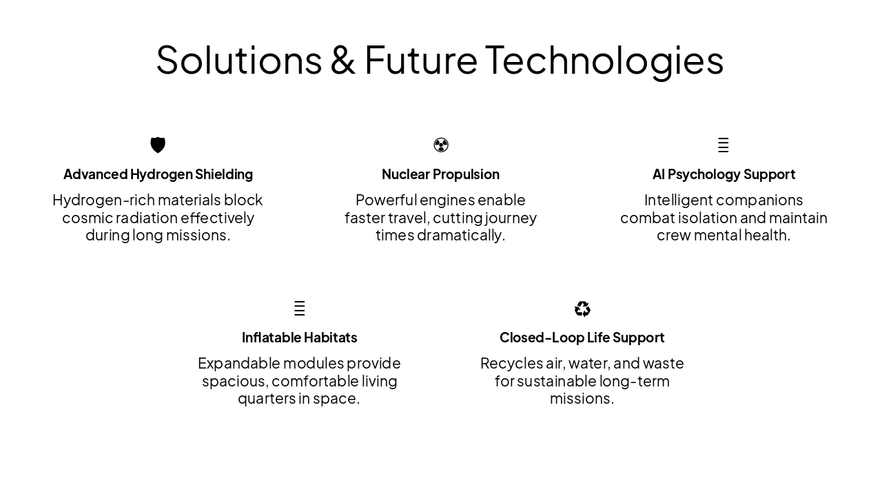 { "features": [ { "icon": "🛡️", "heading": "Advanced Hydrogen Shielding", "description": "Hydrogen-rich materials block cosmic radiation effectively during long missions." }, { "icon": "☢️", "heading": "Nuclear Propulsion", "description": "Powerful engines enable faster travel, cutting journey times dramatically." }, { "icon": "🤖", "heading": "AI Psychology Support", "description": "Intelligent companions combat isolation and maintain crew mental health." }, { "icon": "🎈", "heading": "Inflatable Habitats", "description": "Expandable modules provide spacious, comfortable living quarters in space." }, { "icon": "♻️", "heading": "Closed-Loop Life Support", "description": "Recycles air, water, and waste for sustainable long-term missions." } ] }