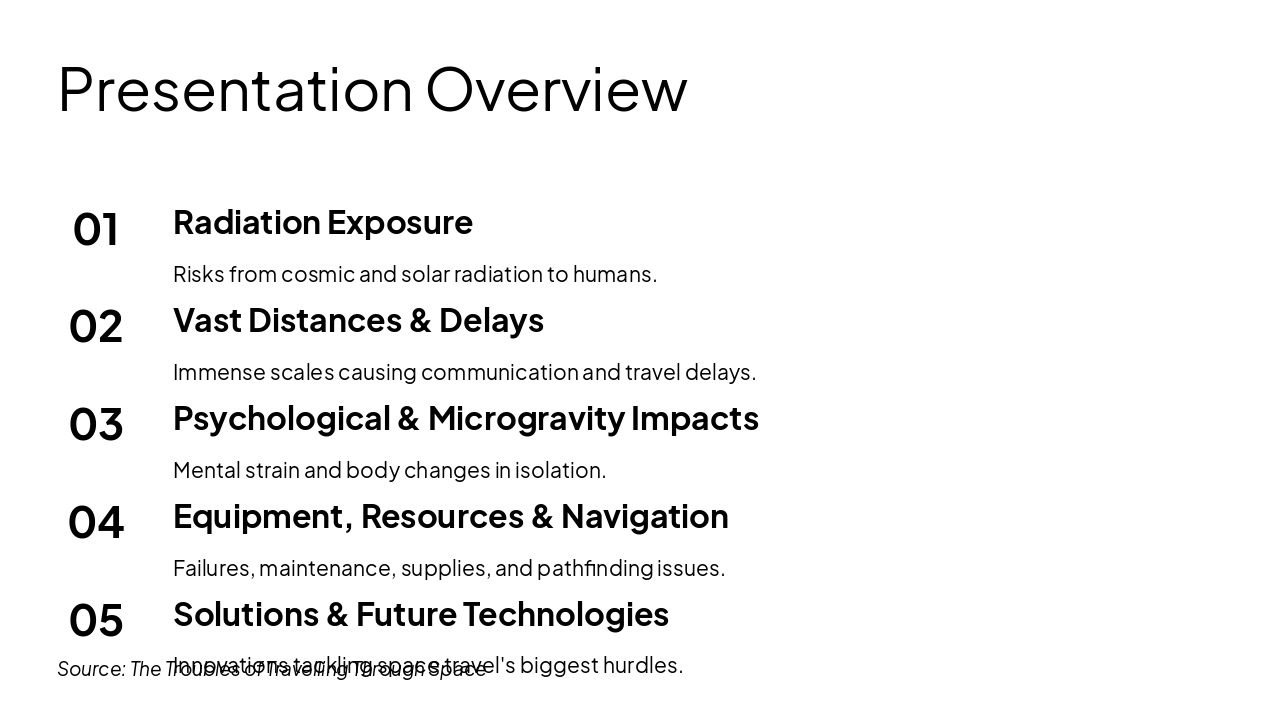The "Solutions & Future Technologies" slide presents a feature grid highlighting five key innovations for long-duration space missions. These include advanced hydrogen shielding against radiation, nuclear propulsion for faster travel, AI psychology support for mental health, inflatable habitats for spacious living, and closed-loop life support for sustainability.