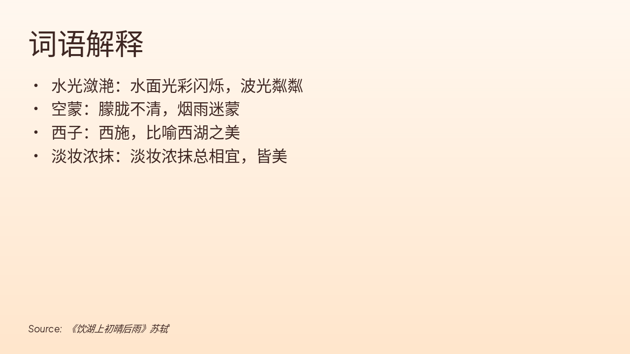 本幻灯片解释了四个词语:水光潋滟(水面光彩闪烁、波光粼粼)、空蒙(朦胧不清、烟雨迷蒙)。此外,还包括西子(比喻西湖之美)和淡妆浓抹(淡妆浓抹总相宜,皆美)。