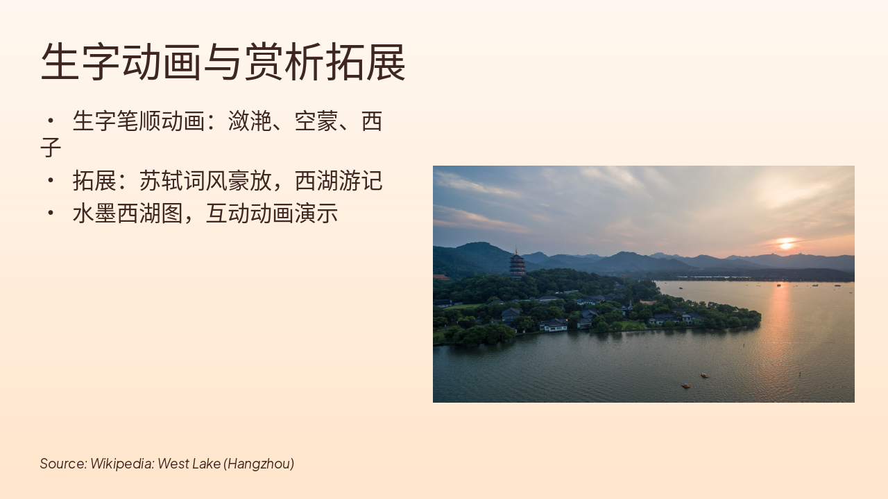 本幻灯片展示生字「潋滟、空蒙、西子」的笔顺动画。 同时拓展苏轼豪放词风与西湖游记,配以水墨西湖图及互动动画演示。
