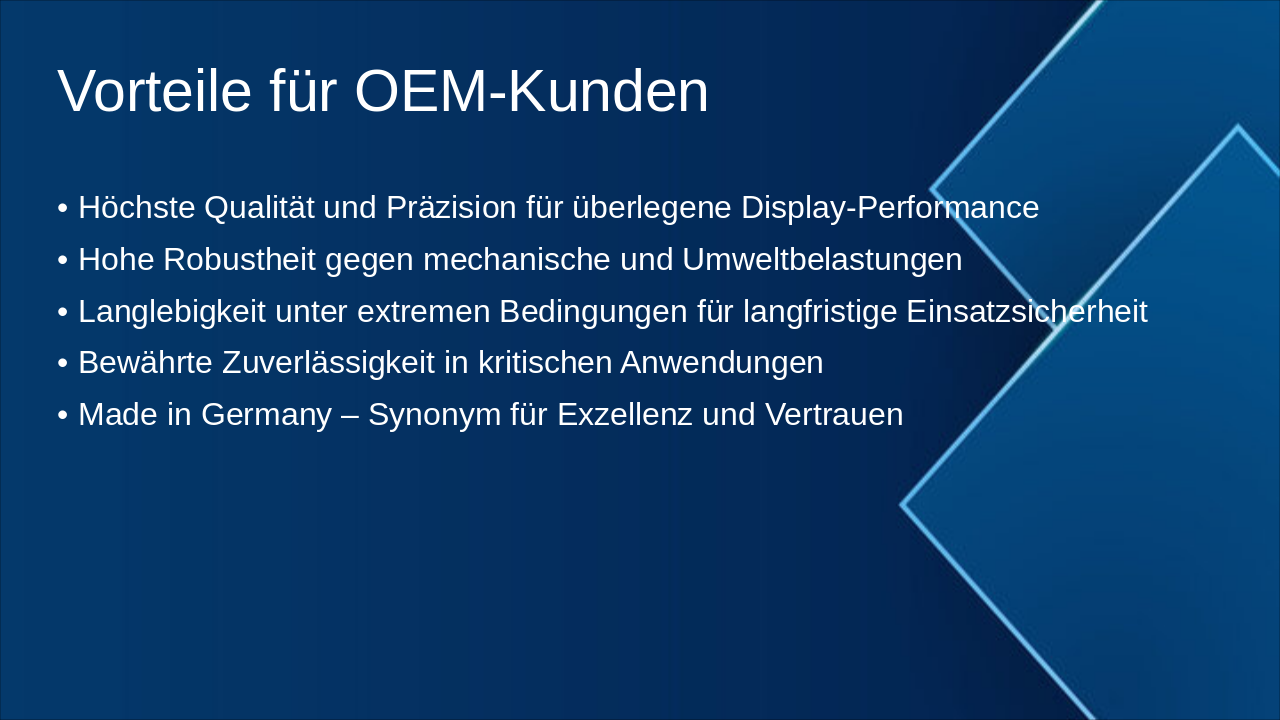 > In der Welt der HMI-Displays zählt Zuverlässigkeit. Als Ihr einziger Partner bieten wir einen nahtlosen Prozess und die Präzision 'Made in Germany' – für höchste Qualität, Robustheit und Langlebigkeit in anspruchsvollen Anwendungen.
