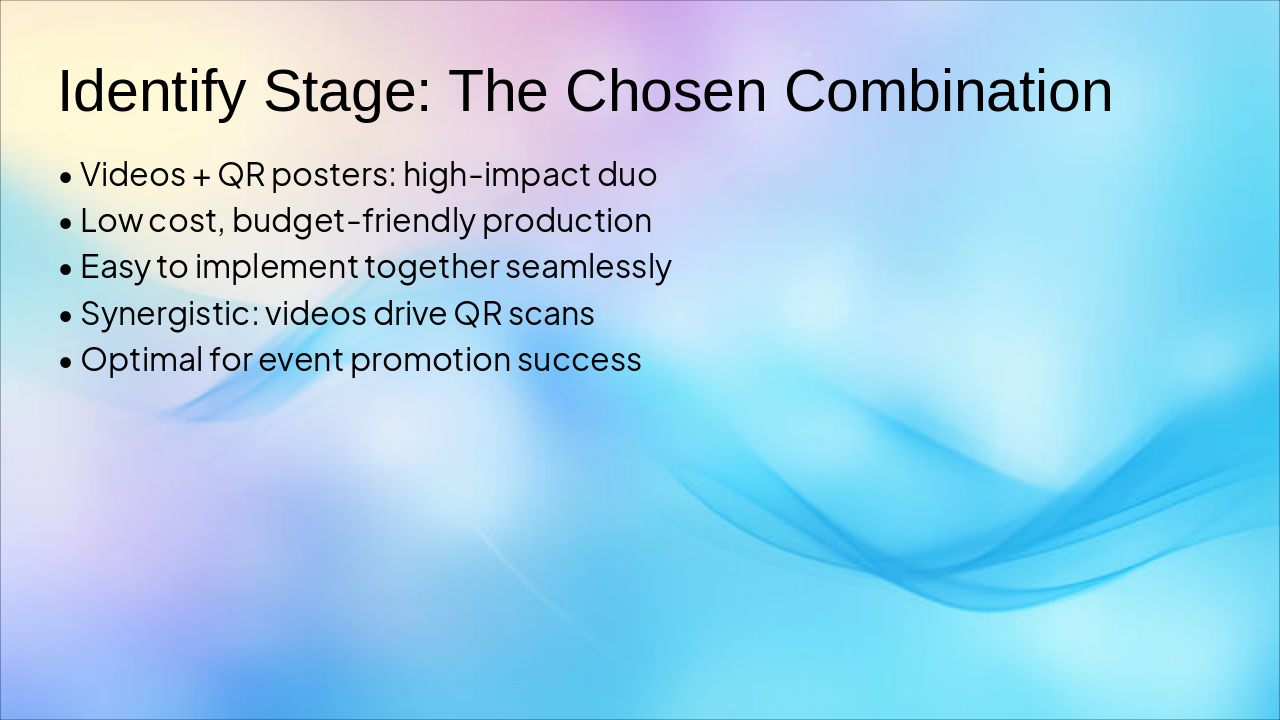 The slide presents Videos + QR posters as the chosen high-impact combination for the Identify Stage. It highlights their low cost, seamless implementation, synergy (videos driving QR scans), and optimality for event promotion success.