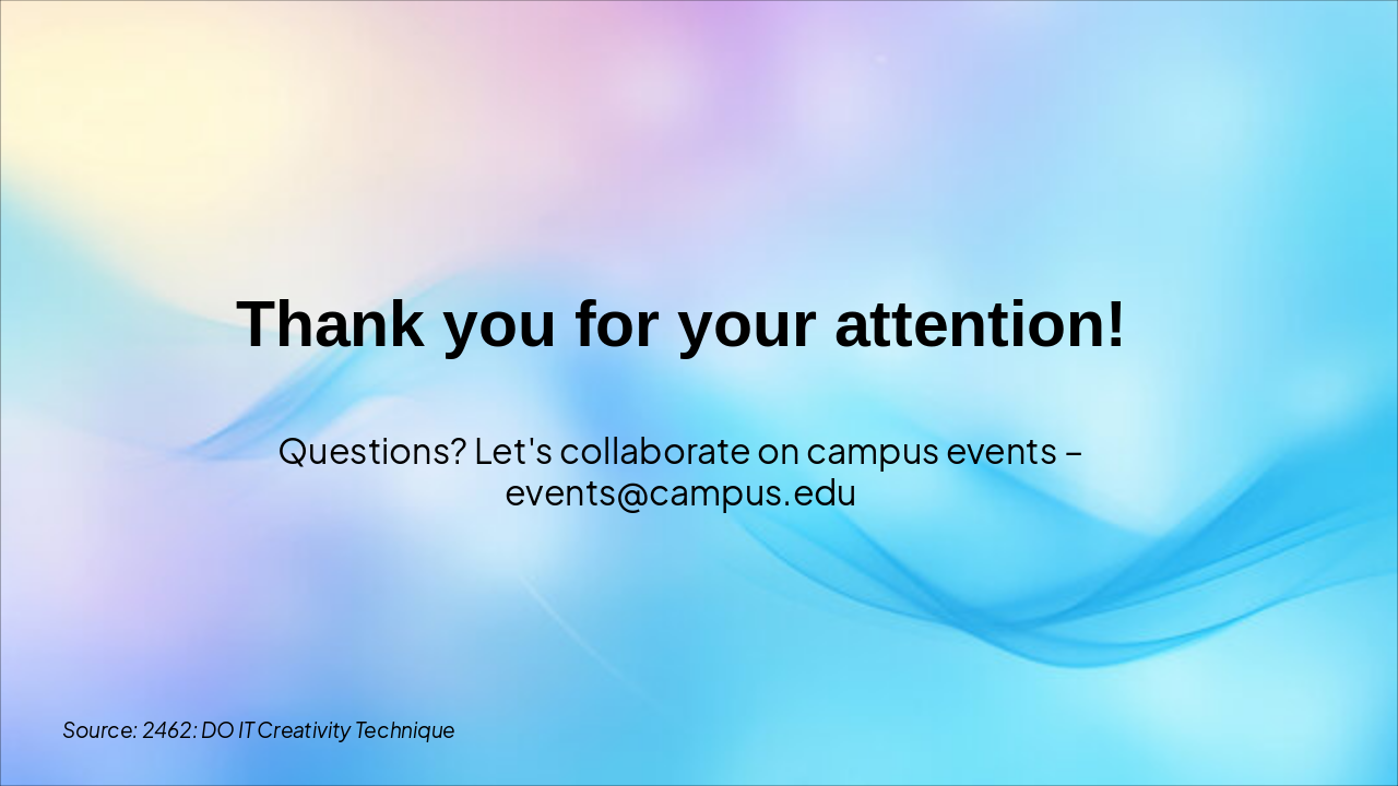 The slide, titled "Thank You / Q&A," thanks the audience for their attention. It invites questions and encourages collaboration on campus events at events@campus.edu.