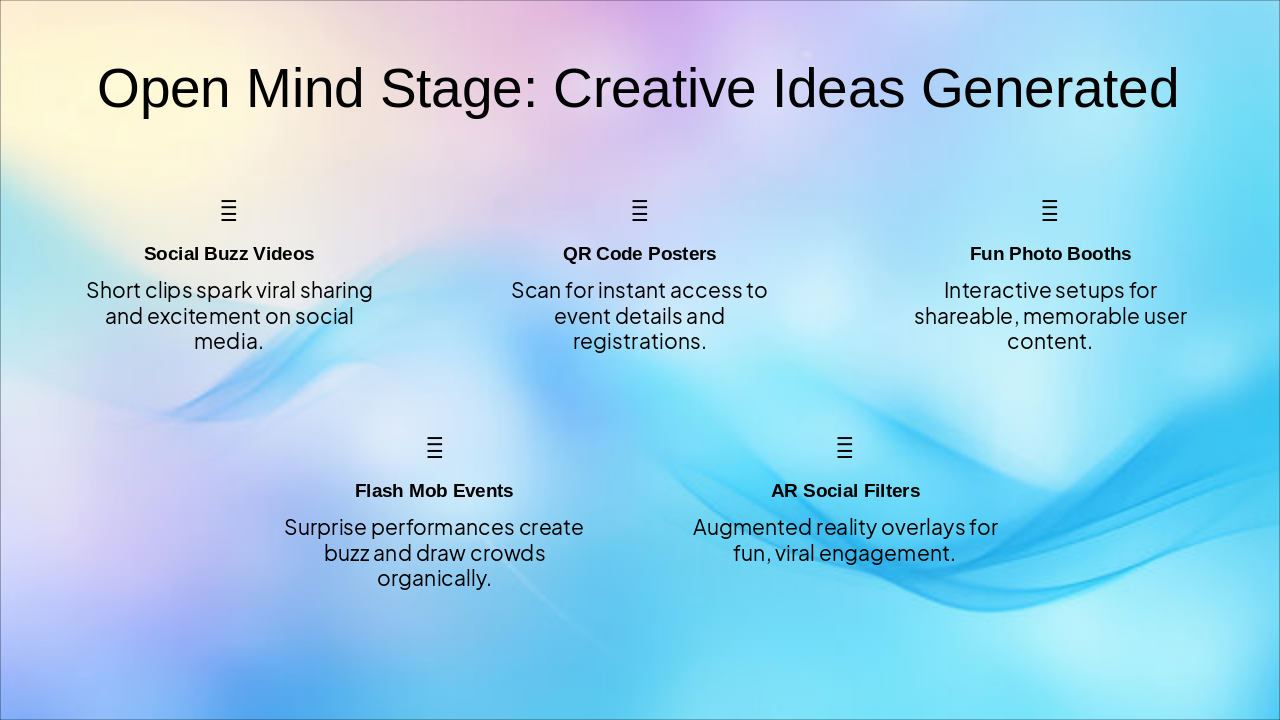 The "Open Mind Stage: Creative Ideas Generated" slide showcases a feature grid of five innovative promotional tools. These include Social Buzz Videos for viral sharing, QR Code Posters for quick access, Fun Photo Booths for memorable content, Flash Mob Events for organic buzz, and AR Social Filters for engaging overlays.