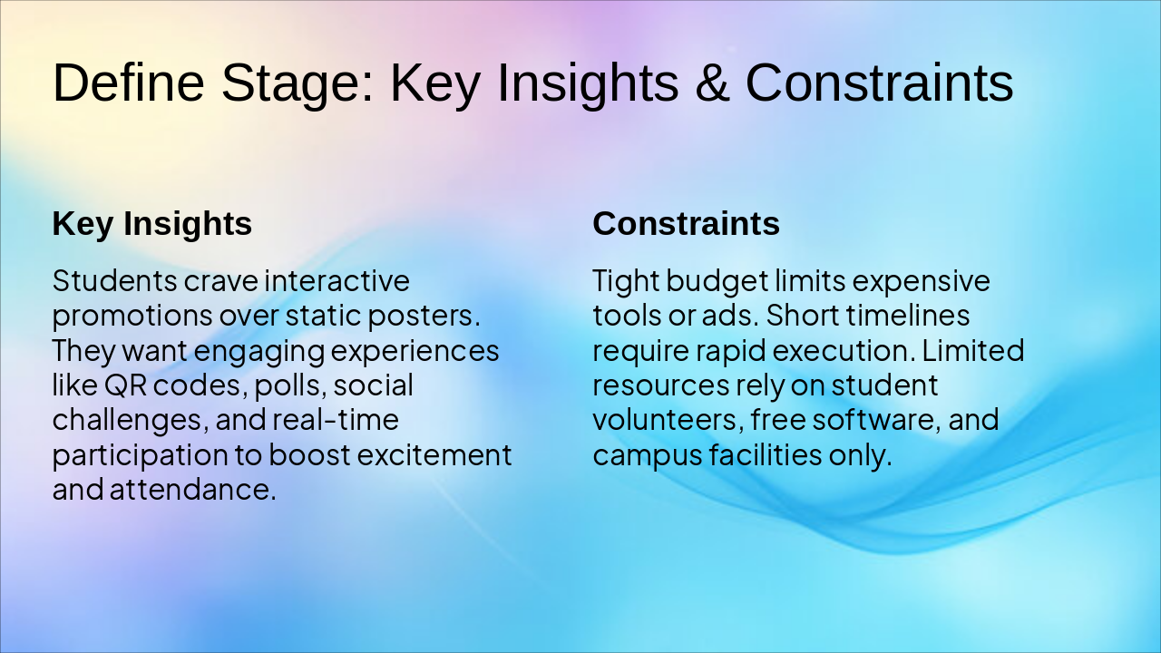 | Students crave interactive promotions over static posters. They want engaging experiences like QR codes, polls, social challenges, and real-time participation to boost excitement and attendance. | Tight budget limits expensive tools or ads. Short timelines require rapid execution. Limited resources rely on student volunteers, free software, and campus facilities only. |
