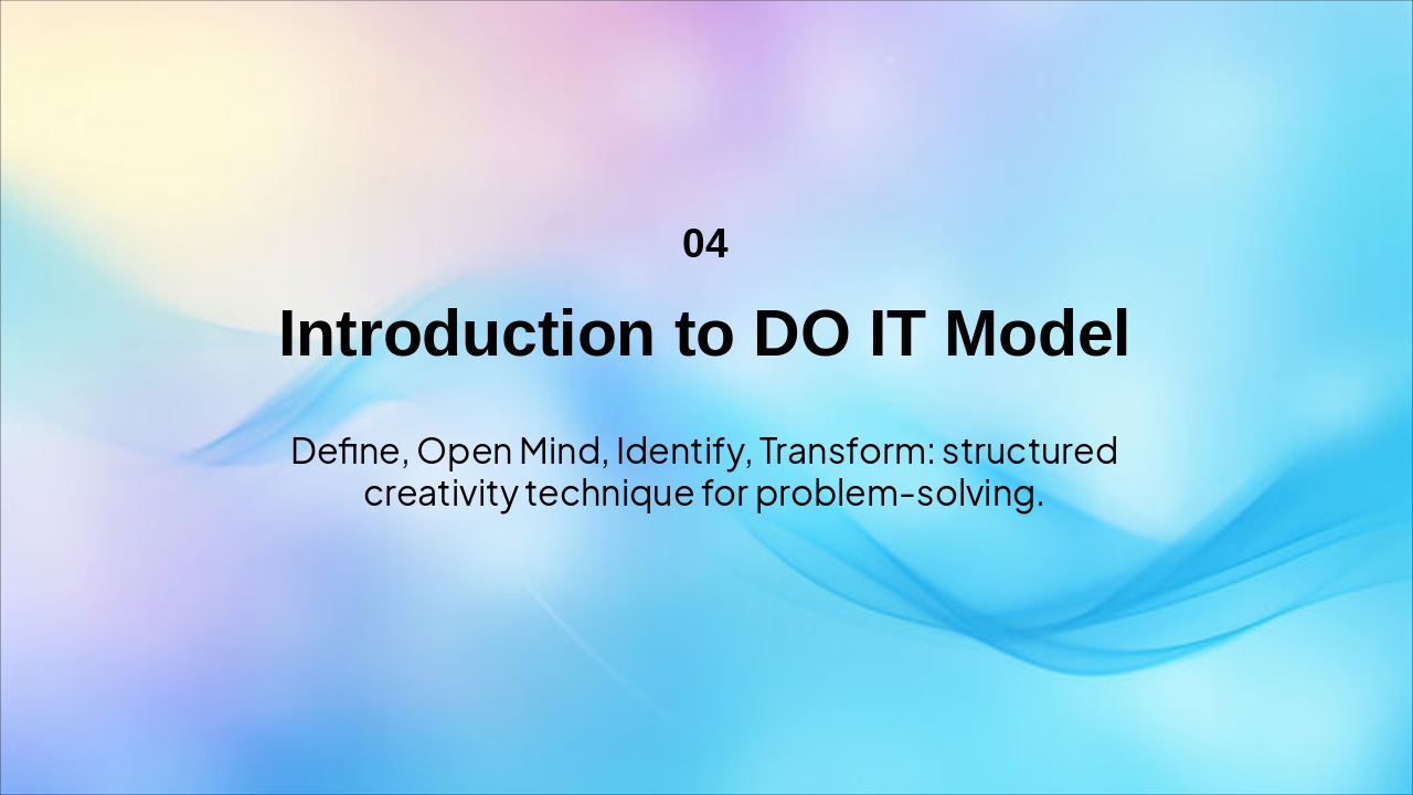 This slide serves as the section header for Section 04, titled "Introduction to DO IT Model." The subtitle defines DO IT as Define, Open Mind, Identify, Transform—a structured creativity technique for problem-solving.