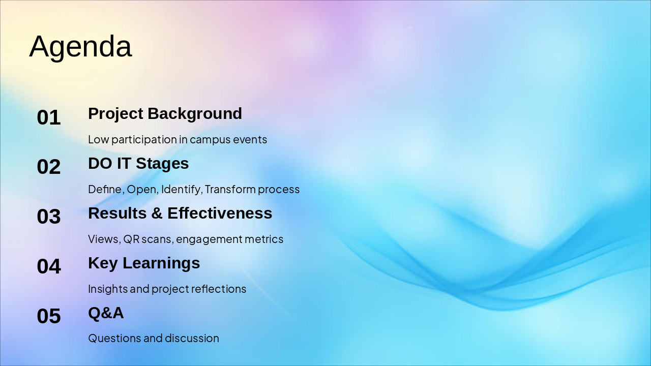 The agenda slide outlines five key sections: Project Background on low campus event participation, DO IT Stages (Define, Open, Identify, Transform process), and Results & Effectiveness via views, QR scans, and engagement metrics. It concludes with Key Learnings from insights and reflections, followed by Q&A.