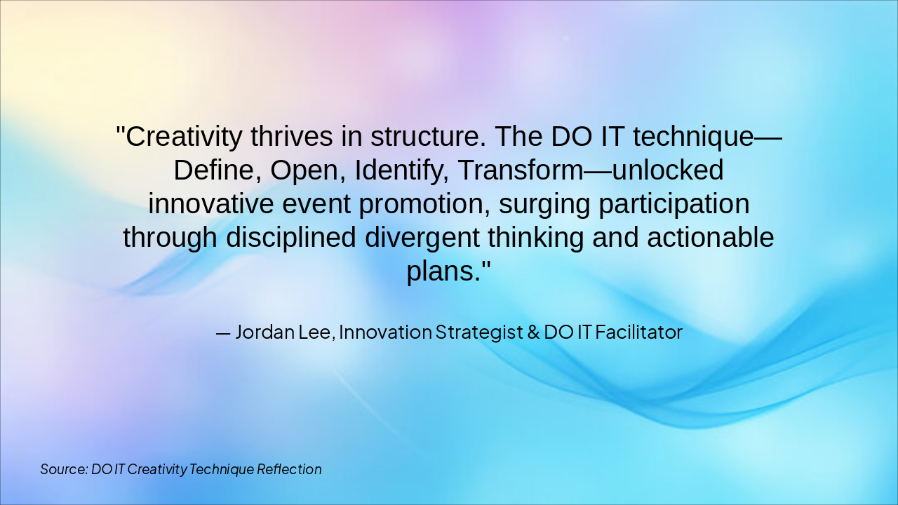 > Creativity thrives in structure. The DO IT technique—Define, Open, Identify, Transform—unlocked innovative event promotion, surging participation through disciplined divergent thinking and actionable plans.