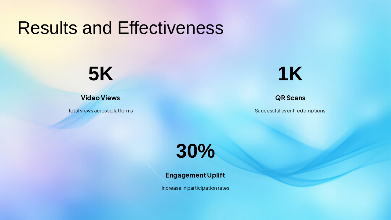 The "Results and Effectiveness" slide showcases key metrics: 5K total video views across platforms and 1K successful QR scans for event redemptions. It also highlights a 30% uplift in engagement and participation rates.