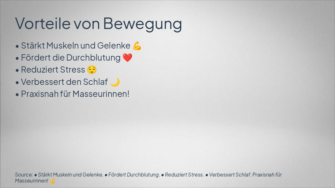 Diese Titel-Folie begrĂŒĂt mit âWillkommen zur PrĂ€sentationâ und prĂ€sentiert das Thema âGesundheitsfördernde Eigenschaften von Bewegungâ. Der Untertitel richtet sich an angehende Masseurinnen und betont einen einfachen, praxisnahen und motivierenden Ansatz đ.