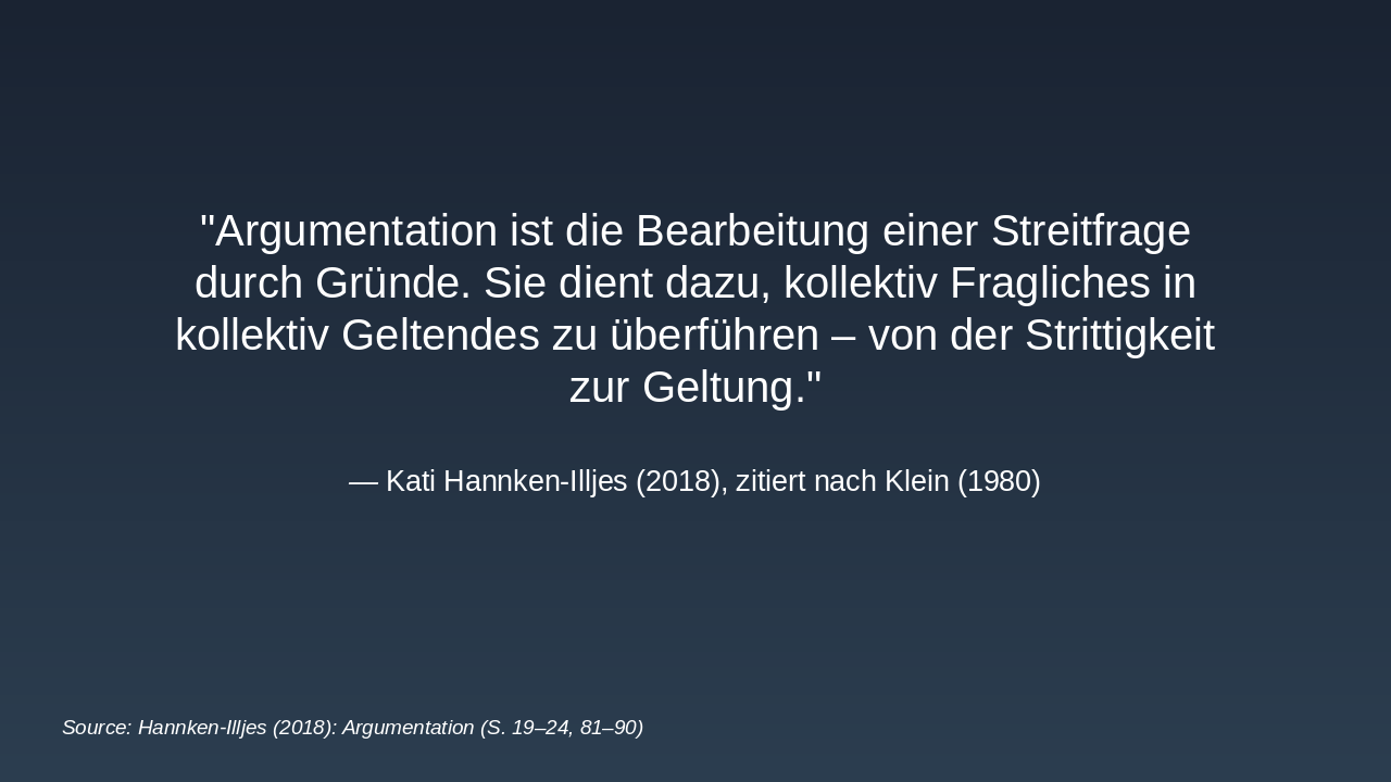 Argumentation bearbeitet Streitfragen durch Gründe, etabliert Geltung und birgt implizite Elemente, die Analyse komplizieren. Basierend auf Hannken-Illjes (2018).