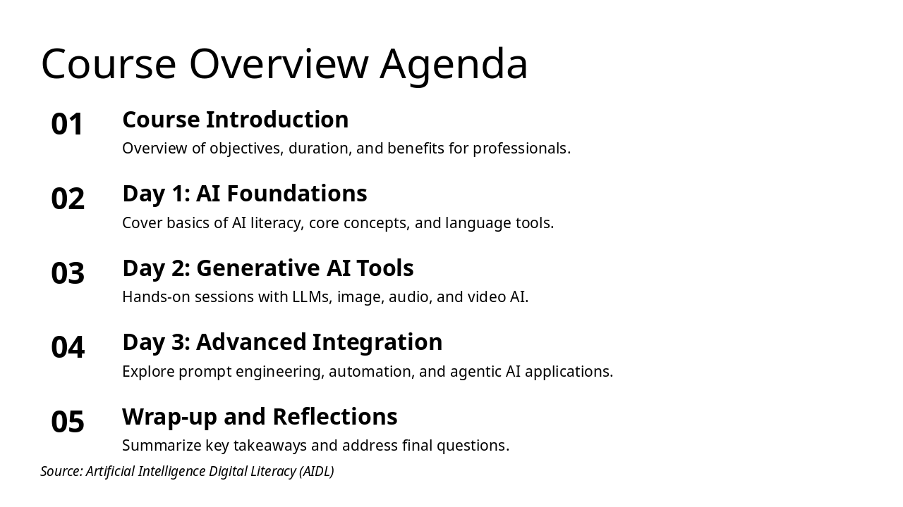 The Course Overview Agenda slide outlines a professional development course on AI, starting with an introduction to objectives, duration, and benefits. It then details the three-day structure—covering AI foundations on Day 1, hands-on generative AI tools on Day 2, advanced integration topics on Day 3—and concludes with wrap-up reflections and Q&A.