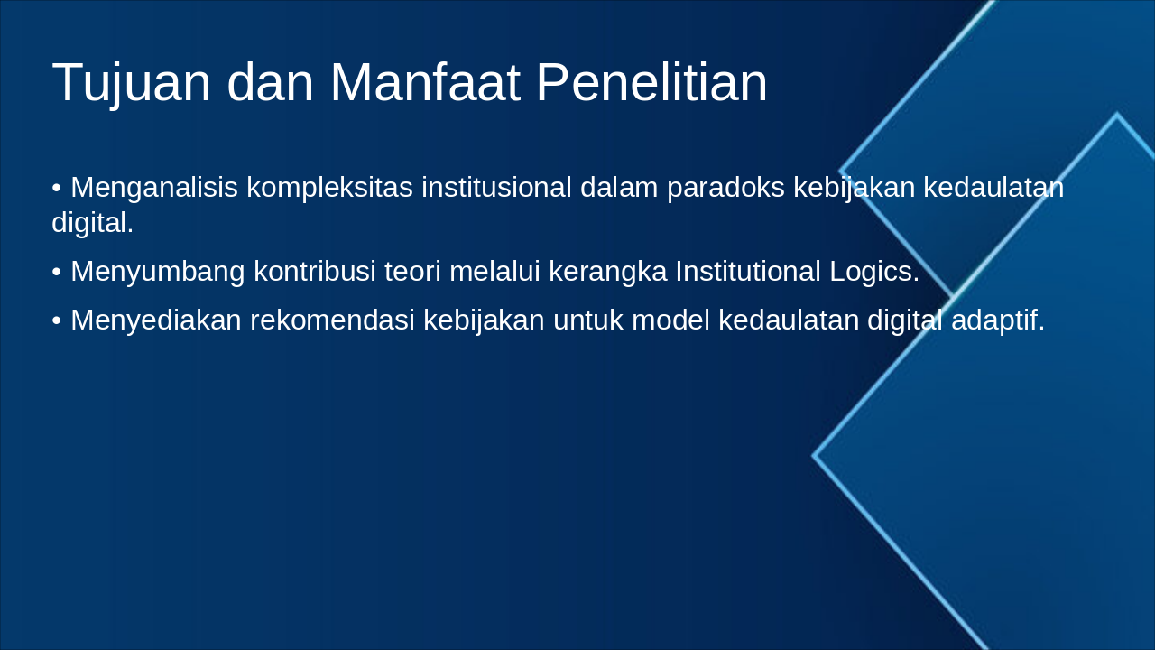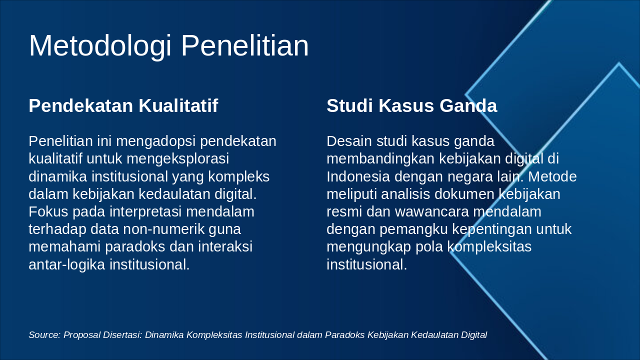 The title slide presents a dissertation proposal titled "Dinamika Kompleksitas Institusional dalam Paradoks Kebijakan Kedaulatan Digital," which explores the institutional complexities and paradoxes in digital sovereignty policies. It includes a subtitle introducing it as an introduction by [Nama Peneliti] on [Tanggal].