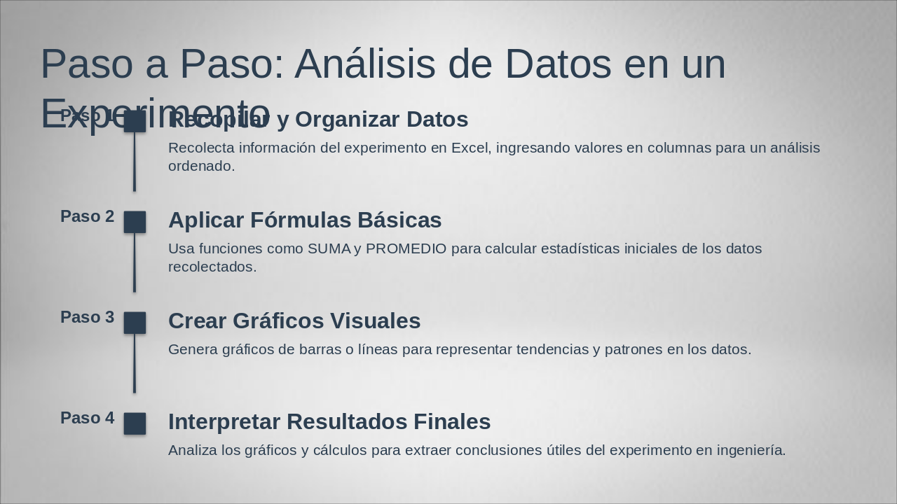 Paso 1: Recopilar y Organizar Datos Recolecta información del experimento en Excel, ingresando valores en columnas para un análisis ordenado. Paso 2: Aplicar Fórmulas Básicas Usa funciones como SUMA y PROMEDIO para calcular estadísticas iniciales de los datos recolectados. Paso 3: Crear Gráficos Visuales Genera gráficos de barras o líneas para representar tendencias y patrones en los datos. Paso 4: Interpretar Resultados Finales Analiza los gráficos y cálculos para extraer conclusiones útiles del experimento en ingeniería.