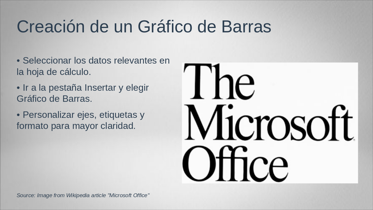 The slide titled "Creación de un Gráfico de Barras" outlines the steps to create a bar chart in a spreadsheet. It instructs to first select relevant data, then go to the Insert tab and choose the Bar Chart option, followed by customizing axes, labels, and formatting for better clarity.